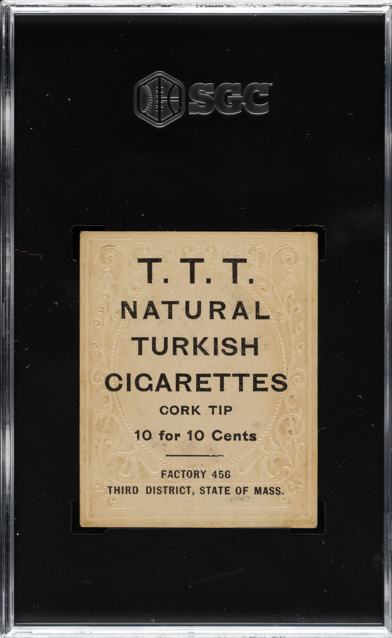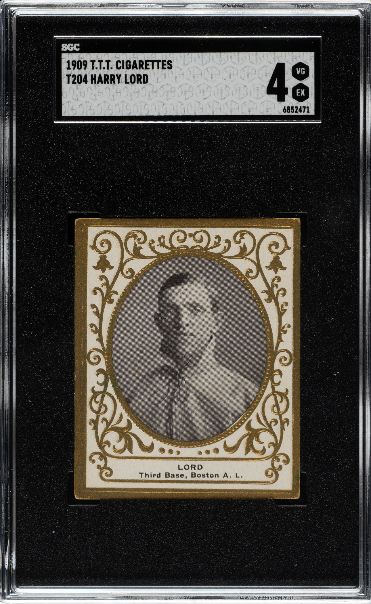 Graded VG/EX 4 by SGC (submitted by REA). T204 Ramly "T.T.T. Cigarettes" advertising card of Harry Lord (Boston Red Sox). All T.T.T. backs are extremely rare. The important T.T.T. back is clean with bold black text. This card is part of an exciting, fresh-to-the-hobby find of T204 Ramly cards that were saved by the family of the original owner who lived in the New England area, all consigned to REA's Spring 2026 and future auctions.