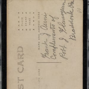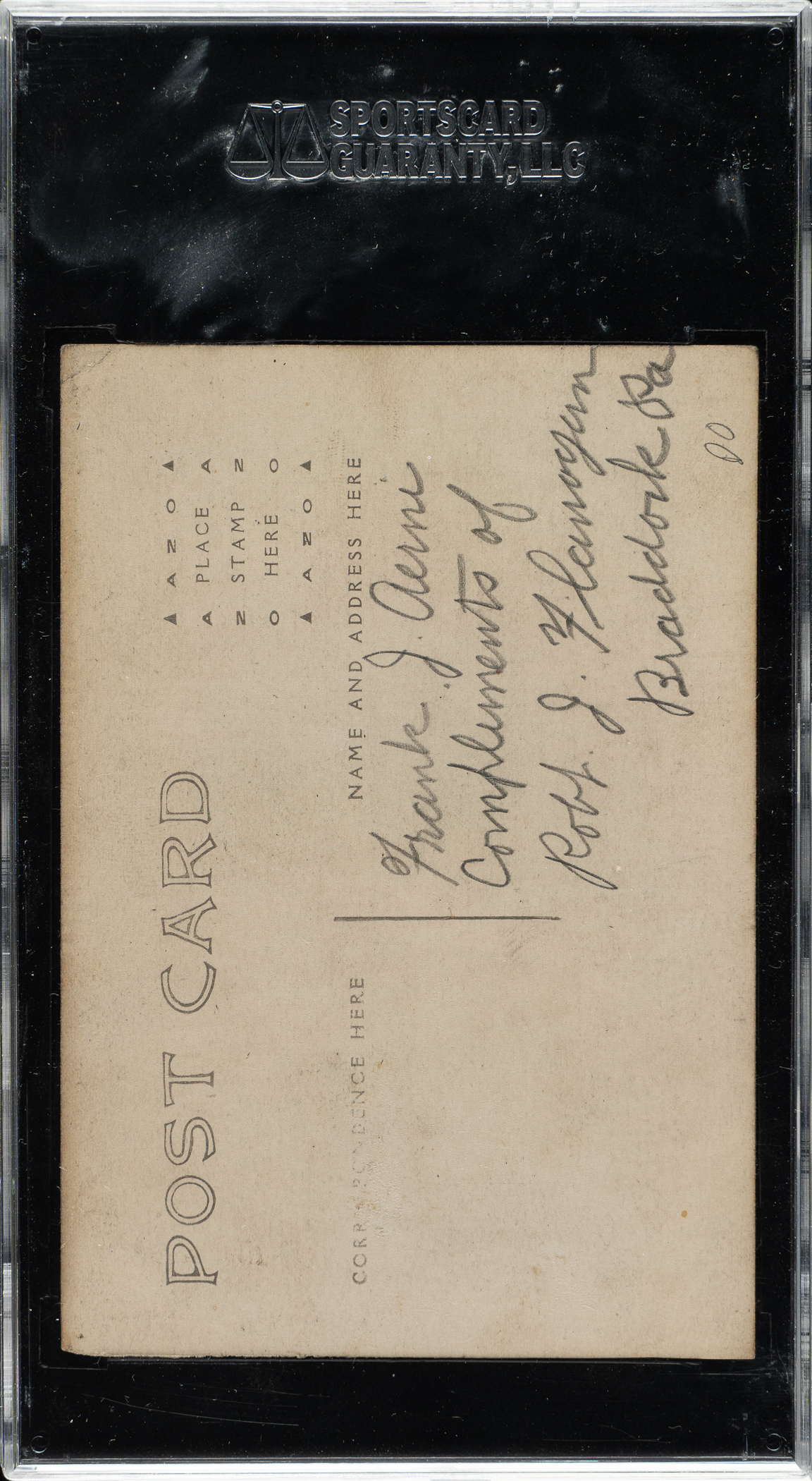 Attractive example of legendary Hall of Famer Honus Wagner from this extremely rare vignette real-photo postcard series issued in 1908. This is a very unusual and distinctive set featuring only Pittsburgh Pirates players, and it is believed that these cards were originally sold as souvenirs at Pittsburgh's Exhibition Field in 1908. Each postcard pictures the player in uniform and includes the player's last name, team, position, and year printed in white lettering within the body of the photo. This issue, designated "PC800," is distinguished by its irregular vignette photo borders and traditional divided postcard reverse. This is just the third example of this postcard we have ever offered. The offered postcard (5-3/8 x 3-3/8 inches) presents as Very Good from the front, with even corner wear, a crease across the upper right corner, and light soiling. The reverse is addressed in pencil (though never mailed), with a very small scrape of paper loss. Encapsulated as "Authentic" by SGC due to a slight trim to the bottom edge. This is a very attractive and rarely seen example that would be at home in any advanced postcard or Honus Wagner collection.