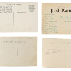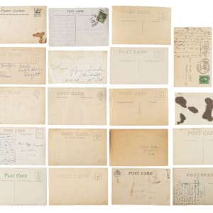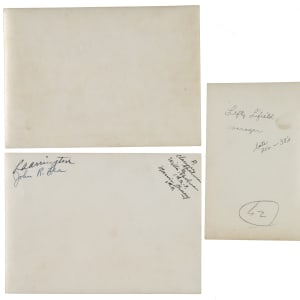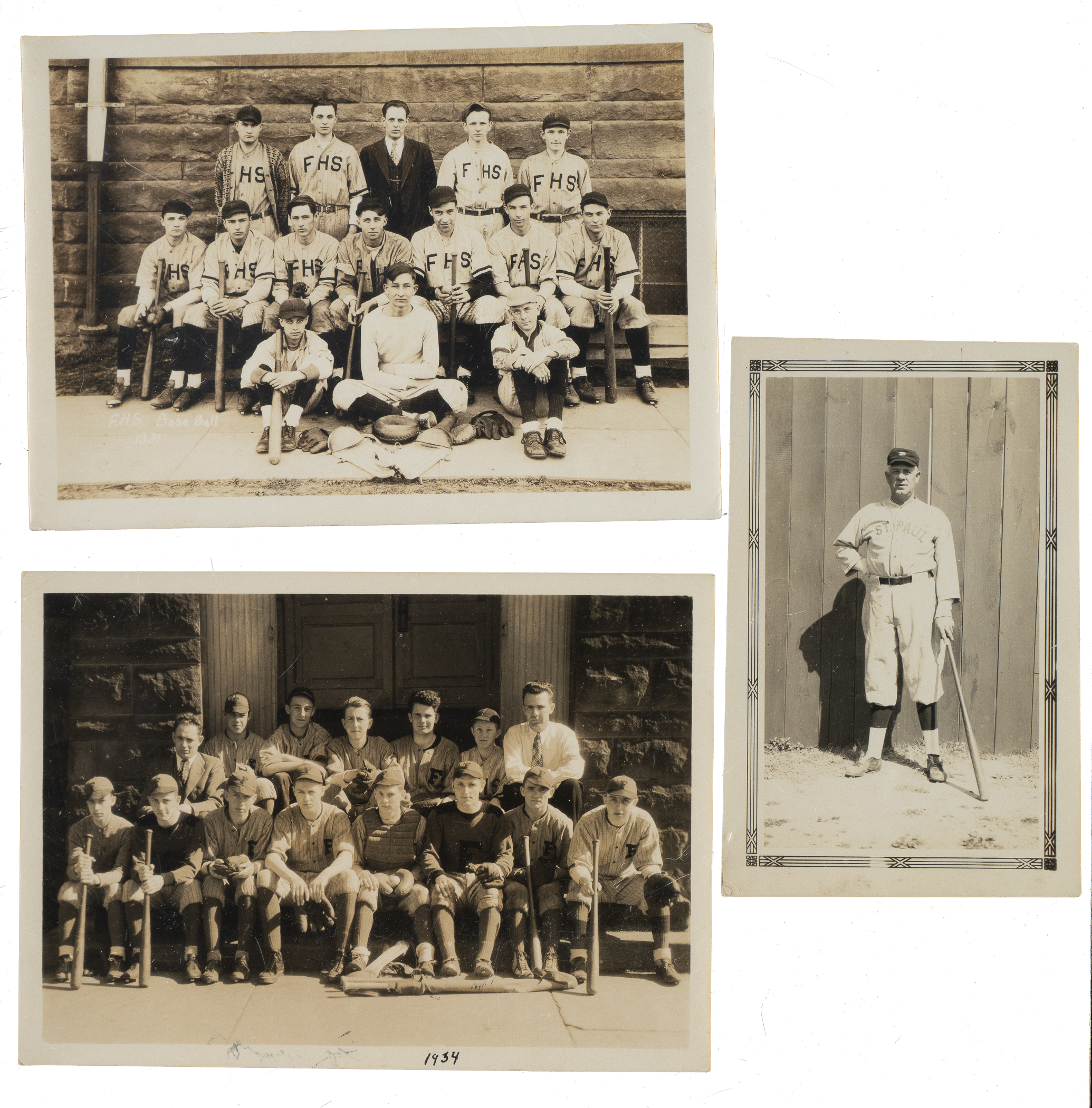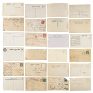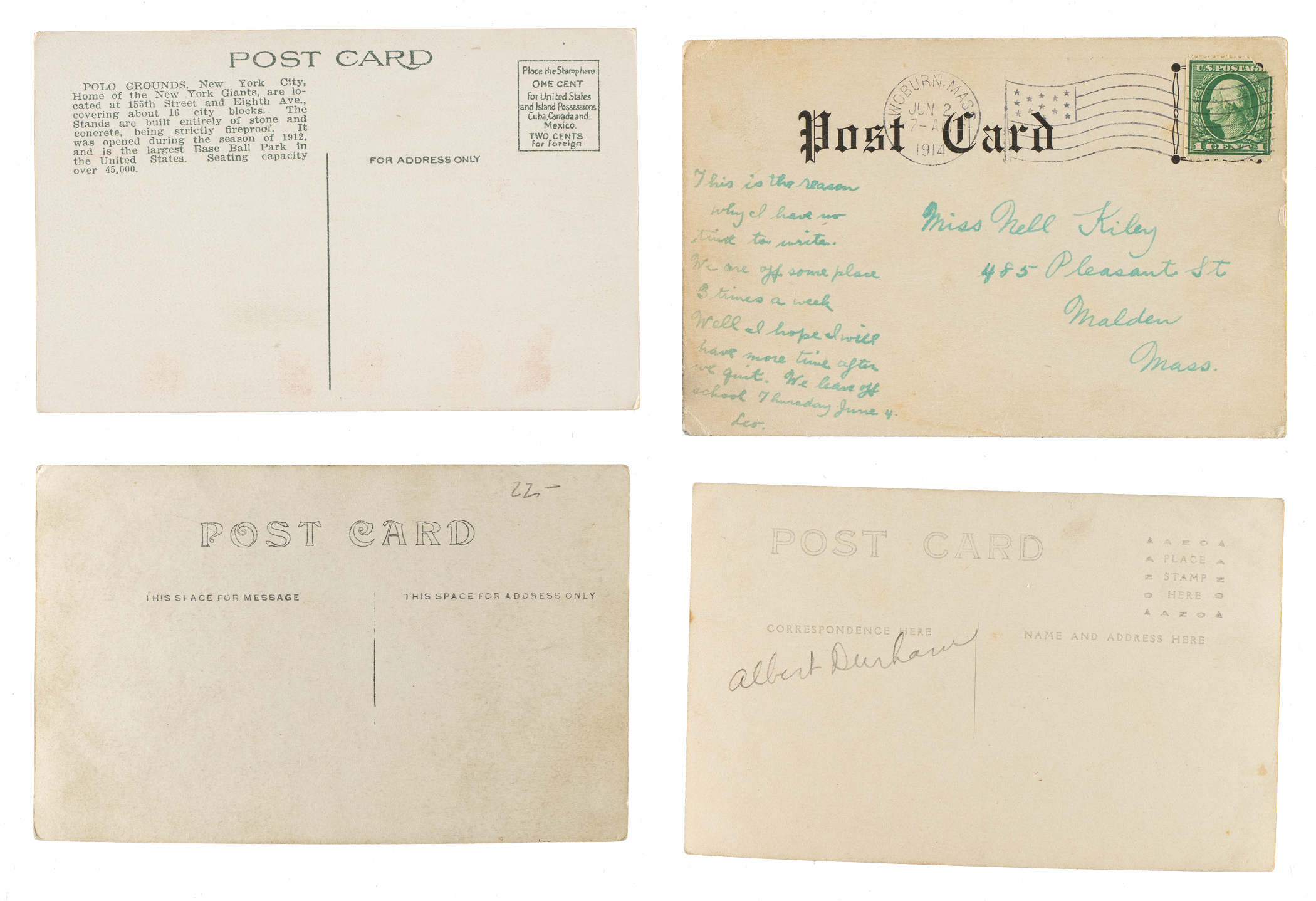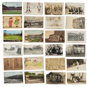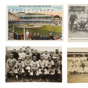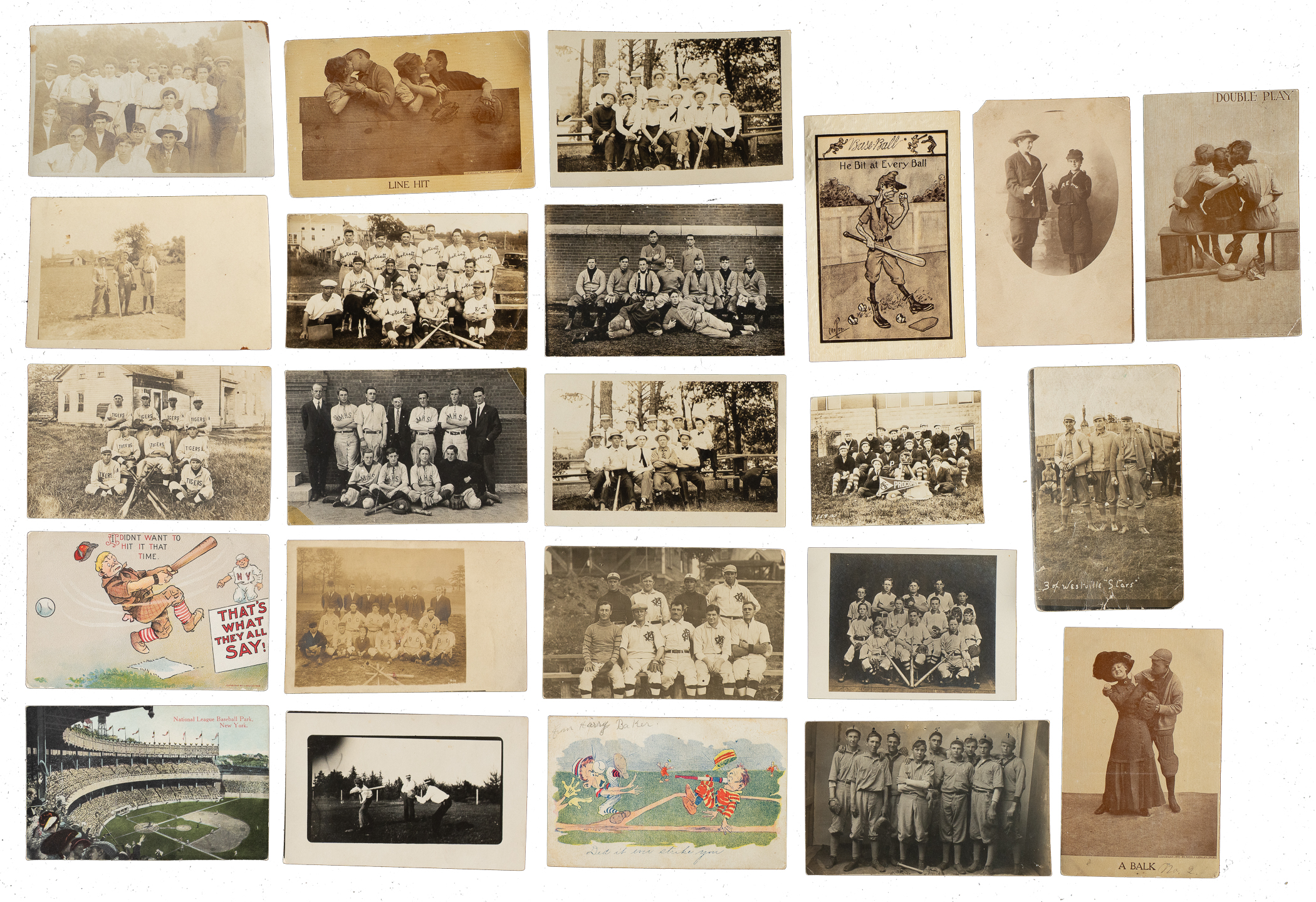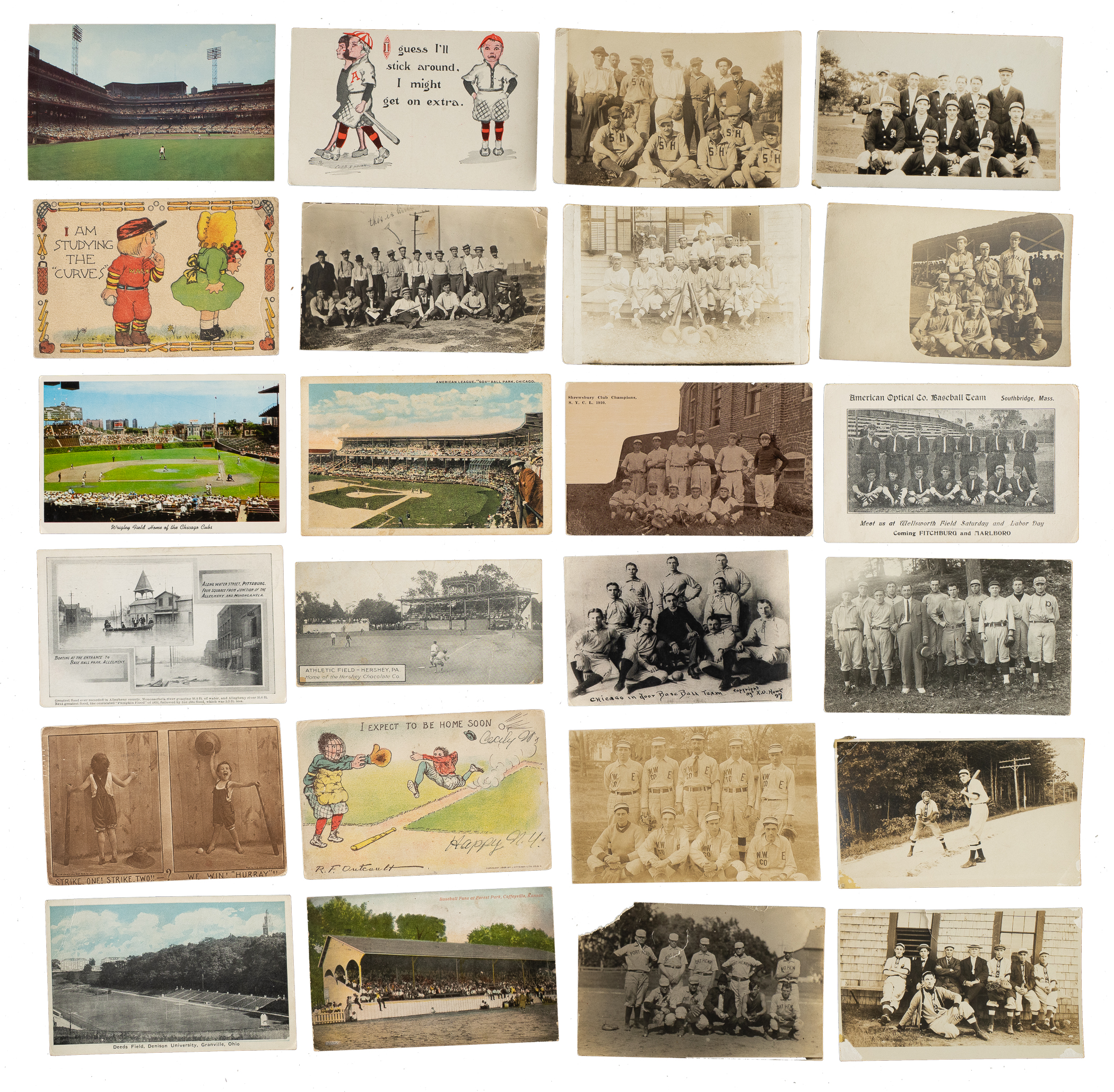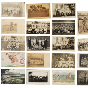 Substantial collection of 54 postcards (mostly the real-photo variety) depicting 1900s- to 1930s-era baseball teams, presumably from the regional amateur, semi-pro, and youth ranks. Also included in the total count are nine baseball stadium postcards, eleven baseball-themed postcards, and three photos. The collection as a whole technically ranges from Pr to Vg, with most offering a very presentable appearance from the fronts. Total: 52 postcards and three photos.