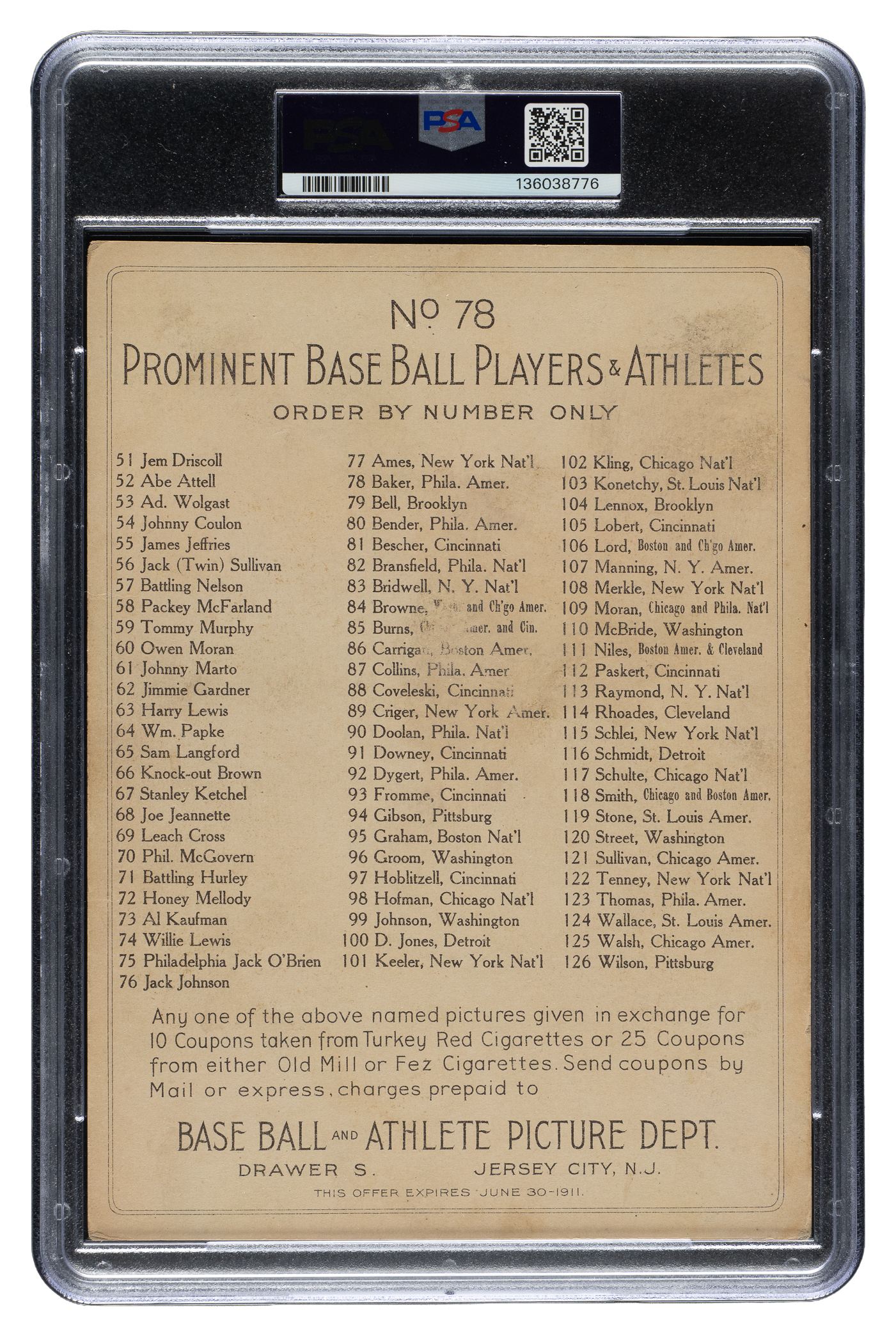 Graded GOOD 2 by PSA. Philadelphia Athletics Hall of Famer Home Run Baker. Few realize that the image on this card is not actually Frank Baker. The image actually features teammate Jack Barry, but was intended to feature Baker, and is generally treated and valued by collectors as a Frank Baker card despite the identification error by Turkey Red card designers.