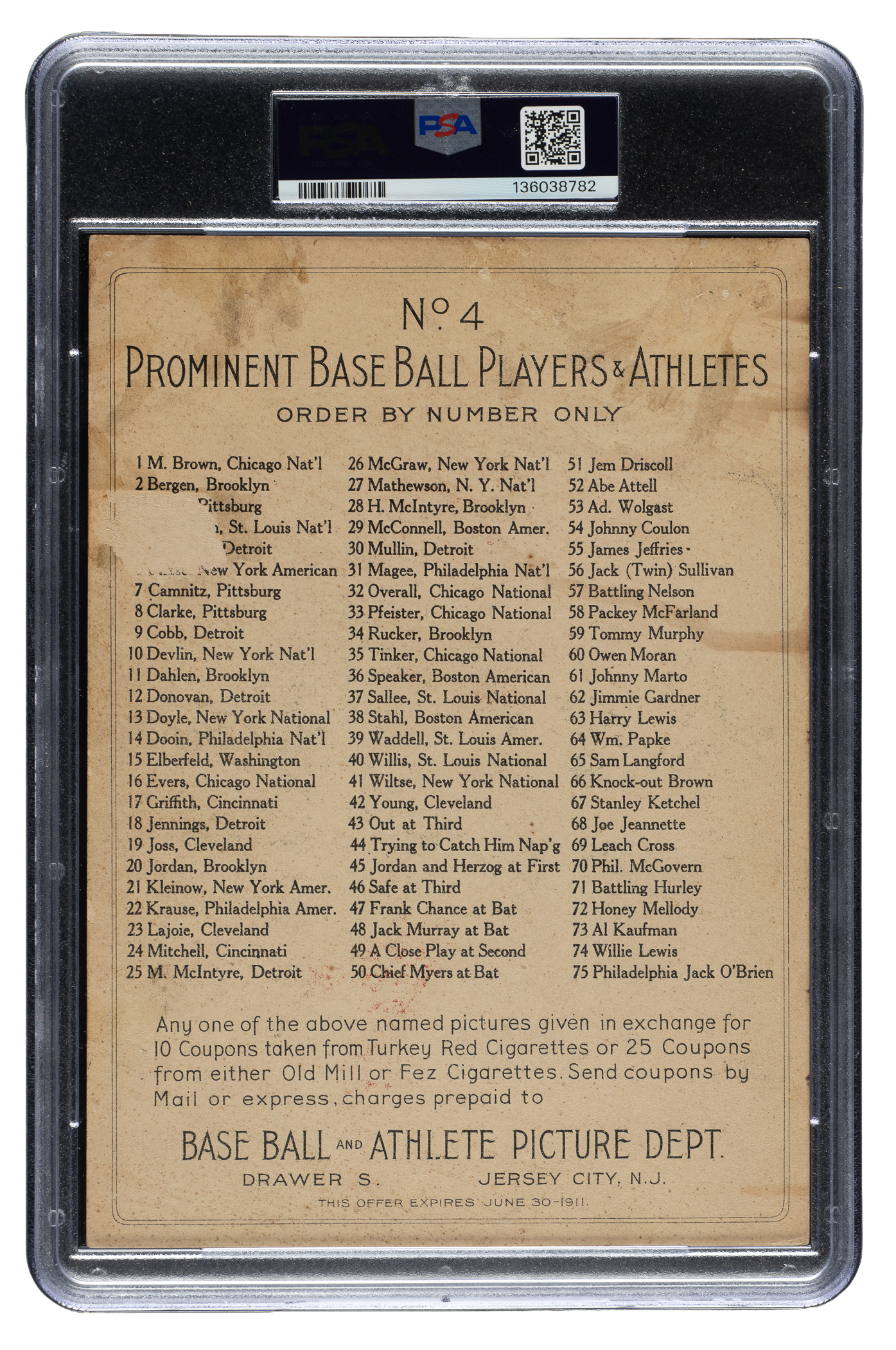 Graded POOR 1 by PSA. St. Louis Cardinals Hall of Famer Roger Bresnahan.