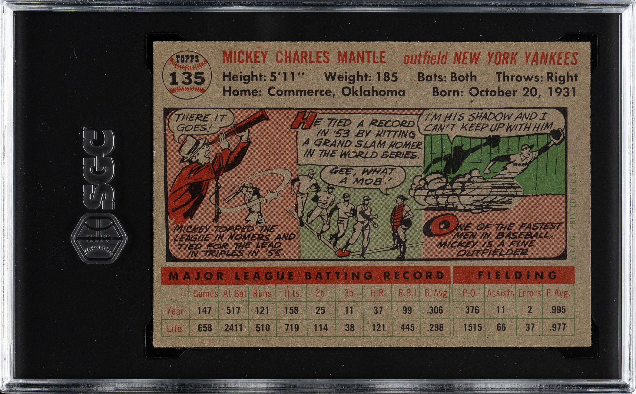 Graded EX/NM+ 6.5 by SGC. Attractive gray-back variety of New York Yankees Hall of Famer Mickey Mantle's 1956 Topps card. The 1956 Topps Mantle card is highly regarded by collectors on many counts. In addition to being a striking card with an exceptional design, this card dates from Mantle's Triple Crown season. This example has bold colors, outstanding registration, and light corner wear. Clean reverse.