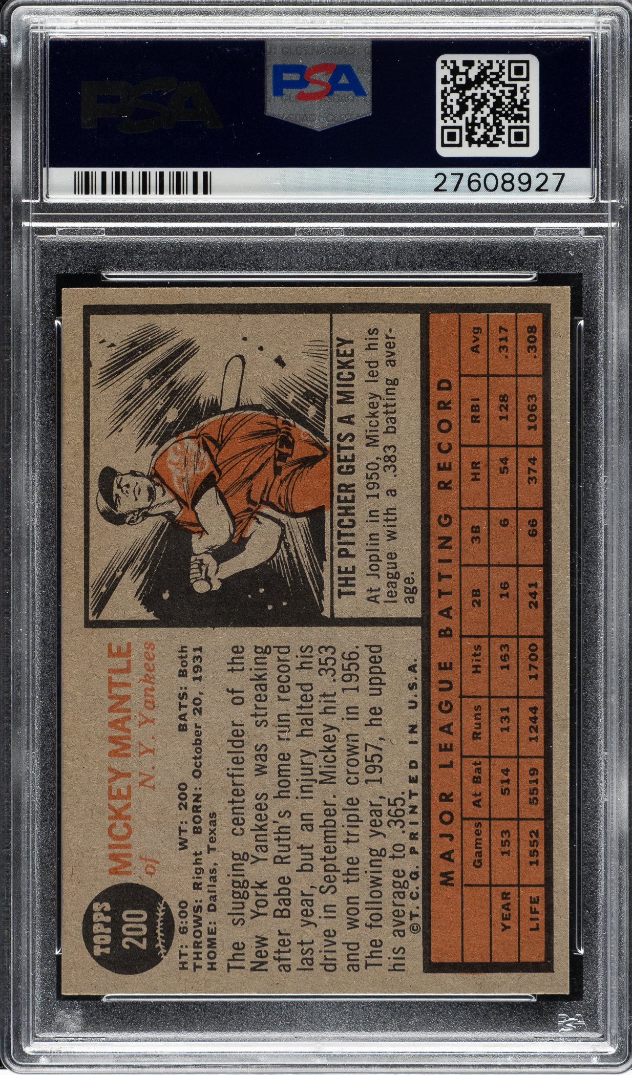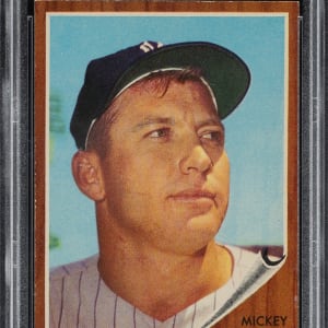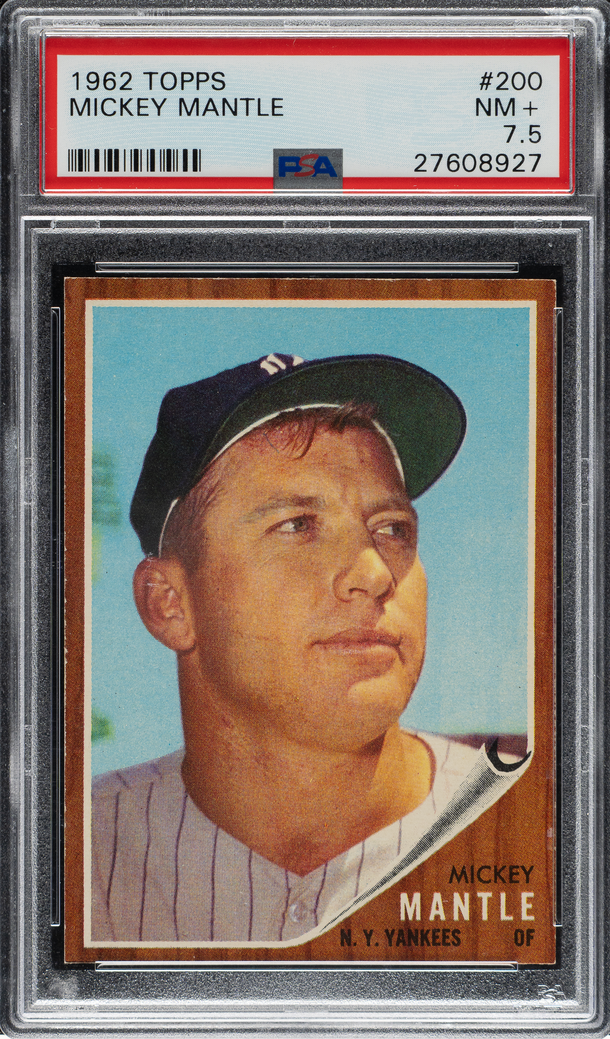 Graded NM+ 7.5 by PSA. Tremendous high-grade example of the key card from the 1962 Topps set: #200 Mickey Mantle. This example has superb image quality, minimal wear to the condition-sensitive brown borders, and strong corners. Clean reverse. Impressive high-grade example featuring this New York Yankees Hall of Fame legend.