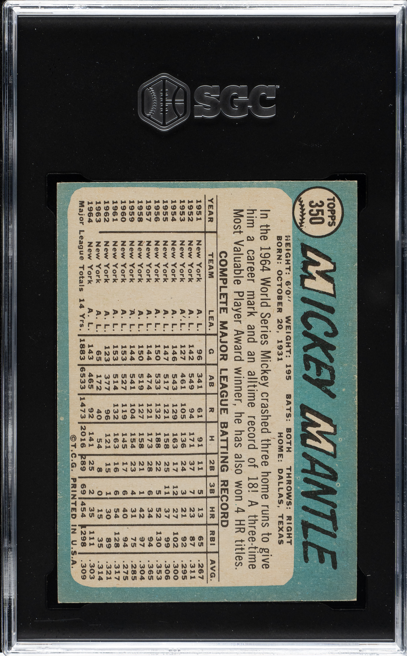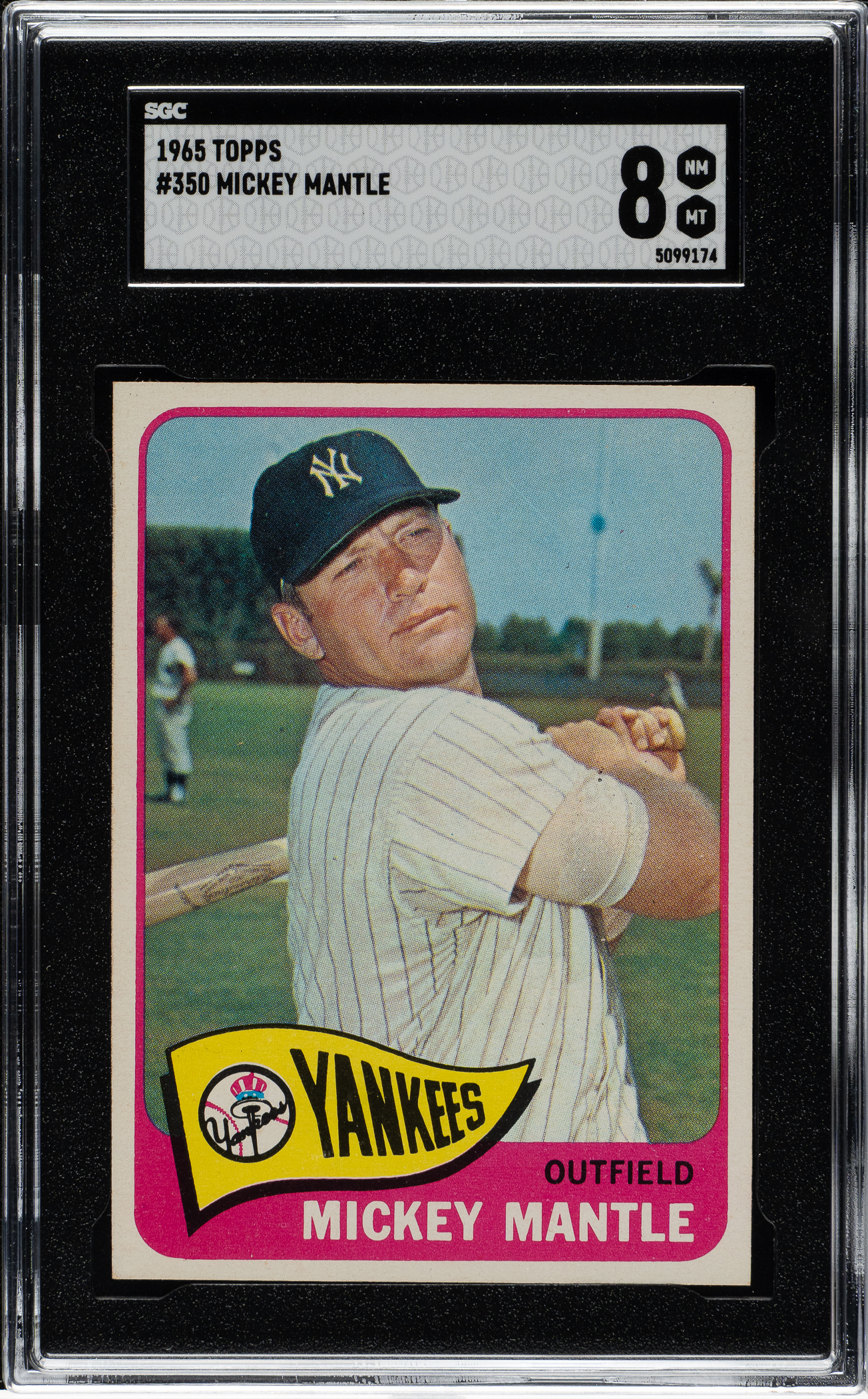 Graded NM/MT 8 by PSA. High-grade example of 1965 Topps #350 Mickey Mantle. This well-centered card has bright colors, a crisp image, and strong corners. Clean reverse. One of Mantle's most popular cards, this is a very attractive example. This is the key card in the set, one of the most highly prized cards of the decade, and one of the cornerstones to a high-grade 1960s Mantle card collection.