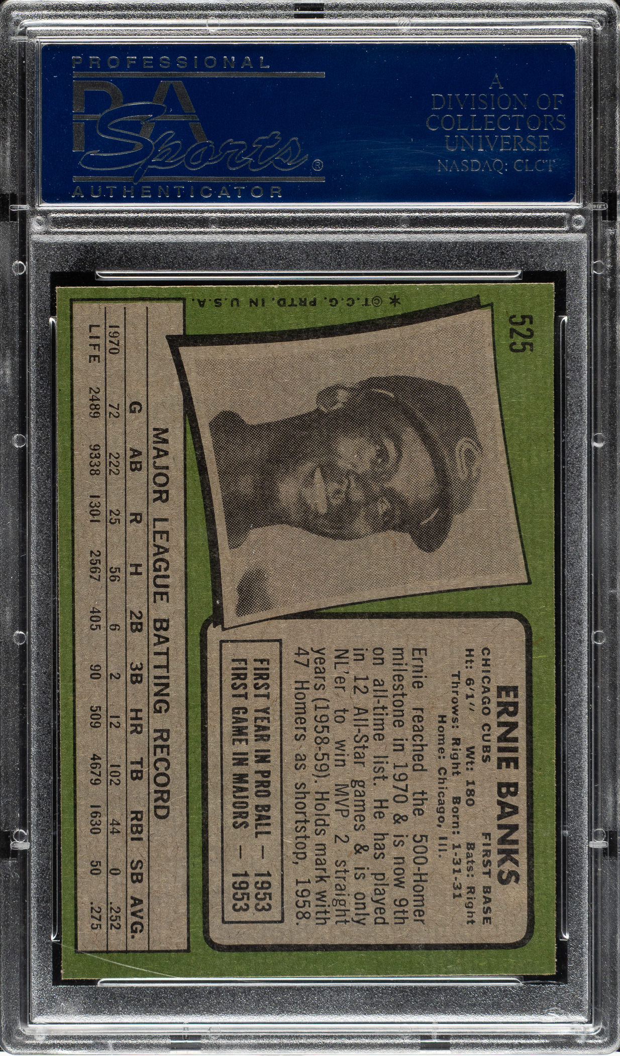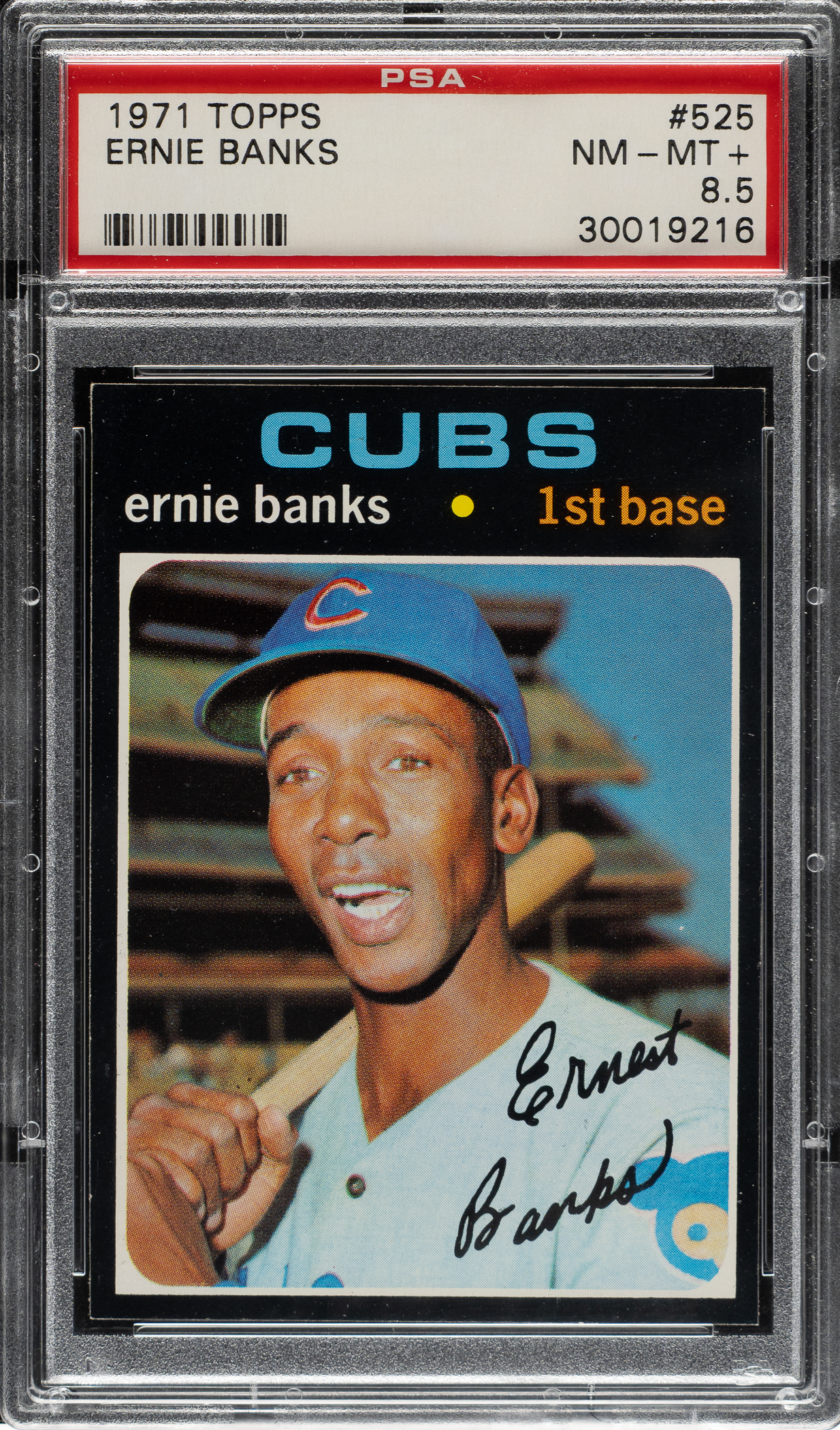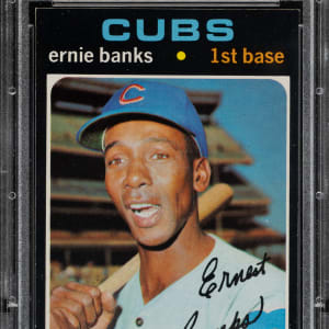 Graded NM-MT+ 8.5 by PSA. Stunning high-grade example of Chicago Cubs Hall of Famer Ernie Banks from the 1971 Topps set. This set is naturally prone to many different problems, including centering issues, print quality, and especially corner and edge chipping. Bright, crisp, and clean, with four strong corners and outstanding centering. Clean reverse. This is a striking high-grade example of Ernie Banks, from one of the most condition-sensitive sets ever produced.