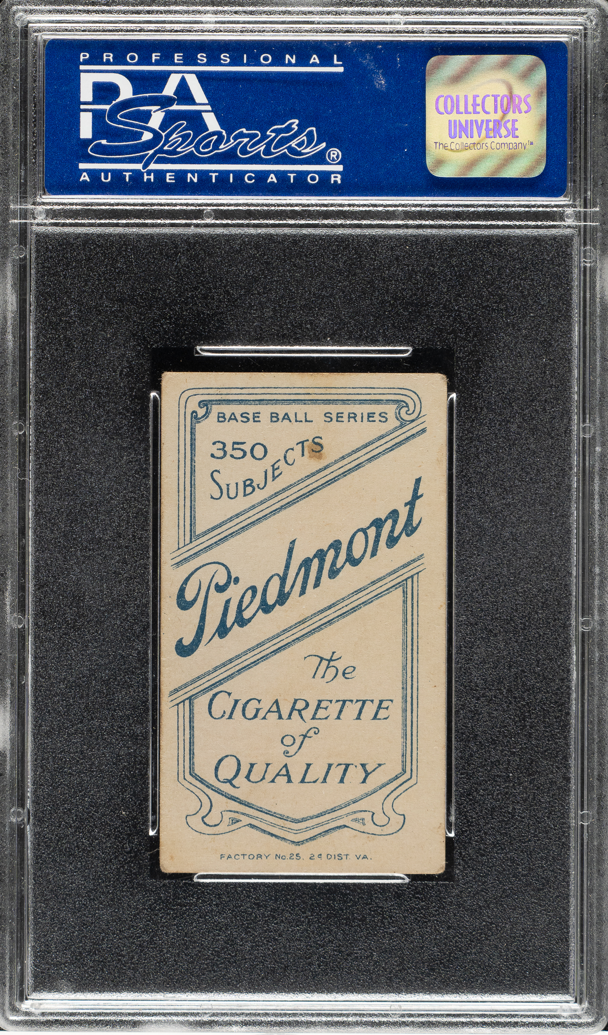 Graded EX 5 by PSA. Mid-grade example of this classic tobacco card of Detroit Tigers Hall of Famer Ty Cobb from the T206 White Borders series. The T206 Ty Cobb bat-on-shoulder pose is one of the key cards in the legendary T206 set. This card has bright colors, excellent registration, and honest corner wear. Boldly printed Piedmont 350 advertising reverse with a spot of discoloration along the upper portion.