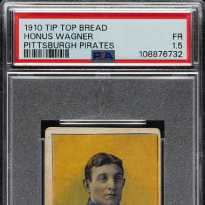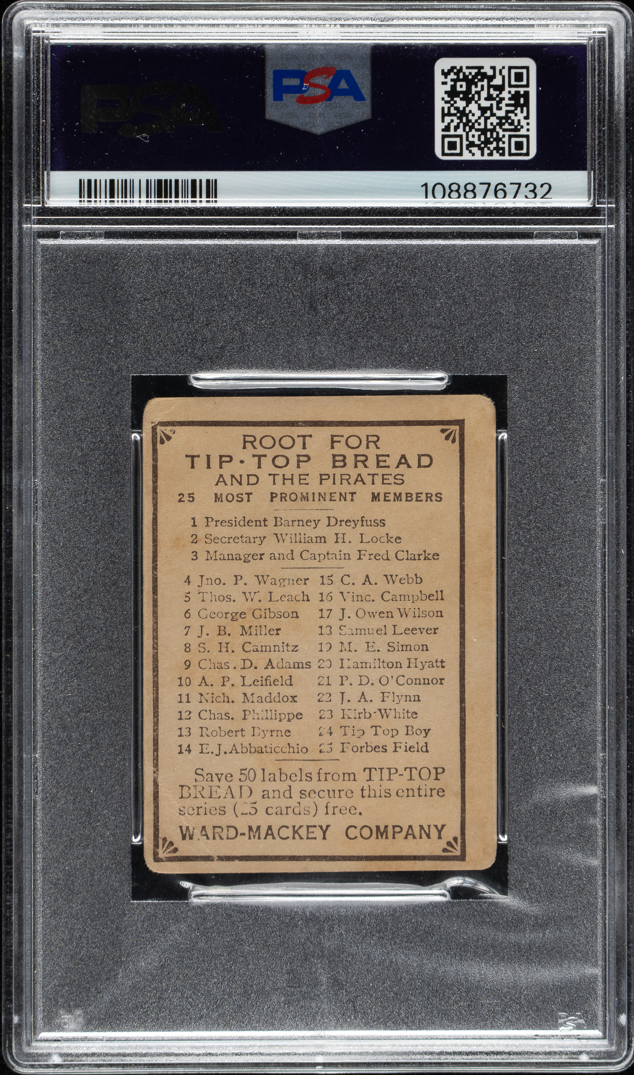 Graded FAIR 1.5 by PSA. Presented is the key card, Honus Wagner, from the 25-card 1910 D322 Tip Top Bread set issued by the Ward-Mackey Company. This very scarce set was regionally issued in the Pittsburgh area and features only members of the Pirates, the National League champions of the previous year. This is one of Honus Wagner's most striking and rare cards, and it features the same Carl Horner image as his famous T206 card. The reverse has advertising for Tip Top Bread and provides a complete checklist for the set. Do not be fooled by the modest assigned grade! This is a tremendous example that shares many characteristics with cards graded Very Good or better. The card displays bold colors, honest wear at the corners, and is downgraded due to an unobtrusive crease in the lower right. The important central image of Wagner is unaffected and remains as striking as ever. The reverse is clean with light toning. This is a very rarely offered and exceptionally attractive example of this extremely significant card, which is universally recognized as among the rarest, most striking, and most desirable of all Honus Wagner cards.