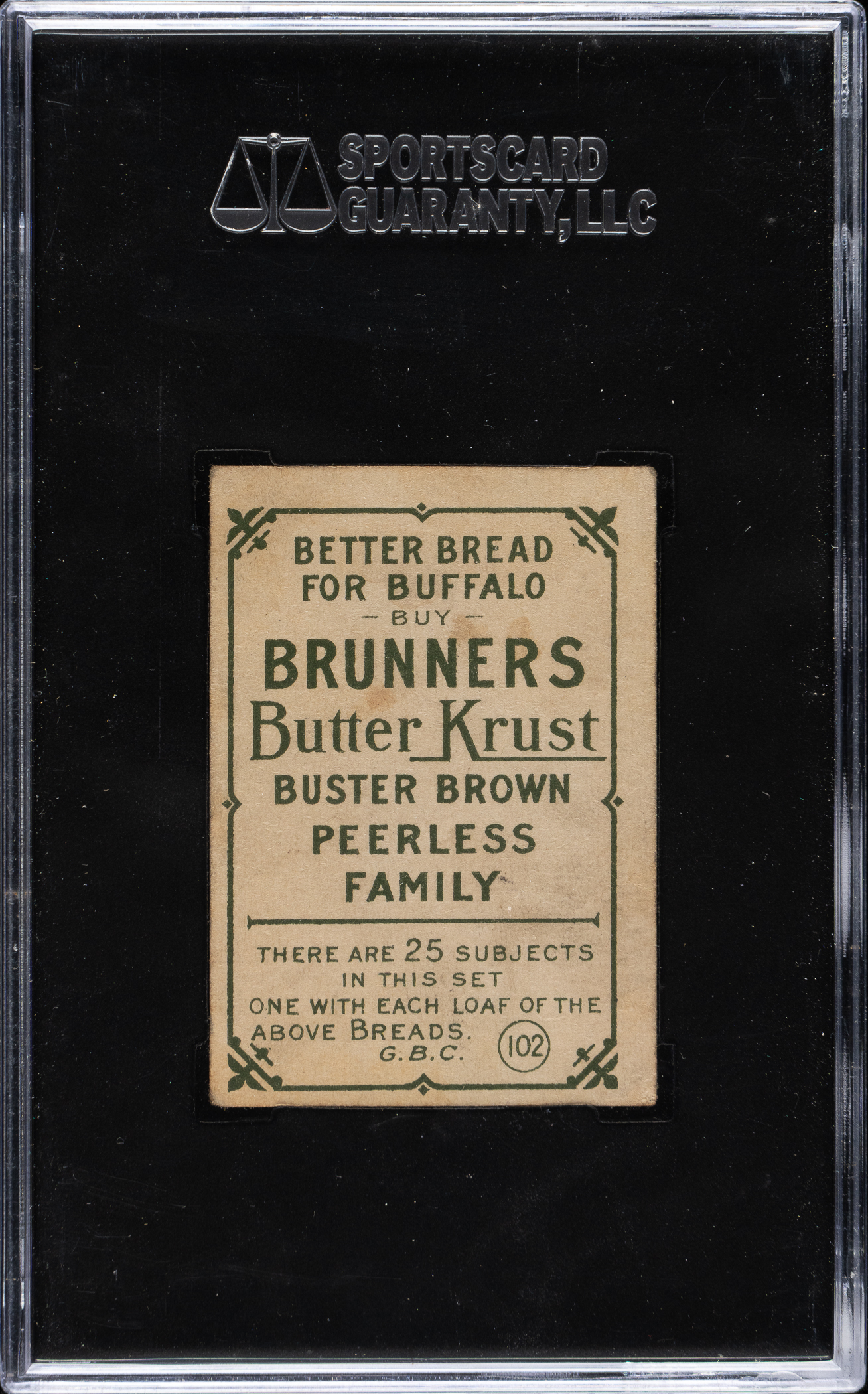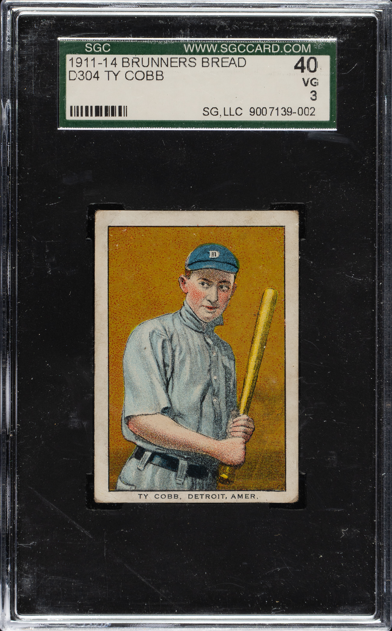 Graded VG 40 by SGC. Presented is the key Hall of Famer from the extremely rare 25-card D304 General Baking Co. brand bread series. This is one of Ty Cobb's rarest, most unusual, and most striking vintage cards. Issued by a bakery in the Buffalo, N.Y. area, these cards are known to have five different back styles (Brunners, Butter Krust, General Baking Co., Weber Bakery, and Martens Bakery). Similar in design to tobacco and candy cards of the era, D304s measure slightly larger than T206s, at 1.75 x 2.5 inches. While not “on the radar” of most collectors, these cards are actually considerably rarer than most 1910-era “E” and “T” card issues. The fronts feature very attractive full-color illustrations, each of which is unique to this issue. In recent years, collectors have shown a growing appreciation for the mystique of the rarest vintage-card issues. D304s certainly fall into this category and have always been appreciated but are rarely offered. D304s were issued in 1911, 1912, 1913, and 1914. This is a very sharp-looking card in all respects with extraordinary eye appeal, and it is well centered with brilliant colors and outstanding registration. The back of the card features advertising for Butter Krust brand bread, which is boldly printed in green. Light, unobtrusive creases contribute to the assigned grade. This is an outstanding example, presenting at a level superior than suggested by the technical grade, of one of Ty Cobb’s, and all of card collecting's, rarest, most majestic, and revered prewar cards.