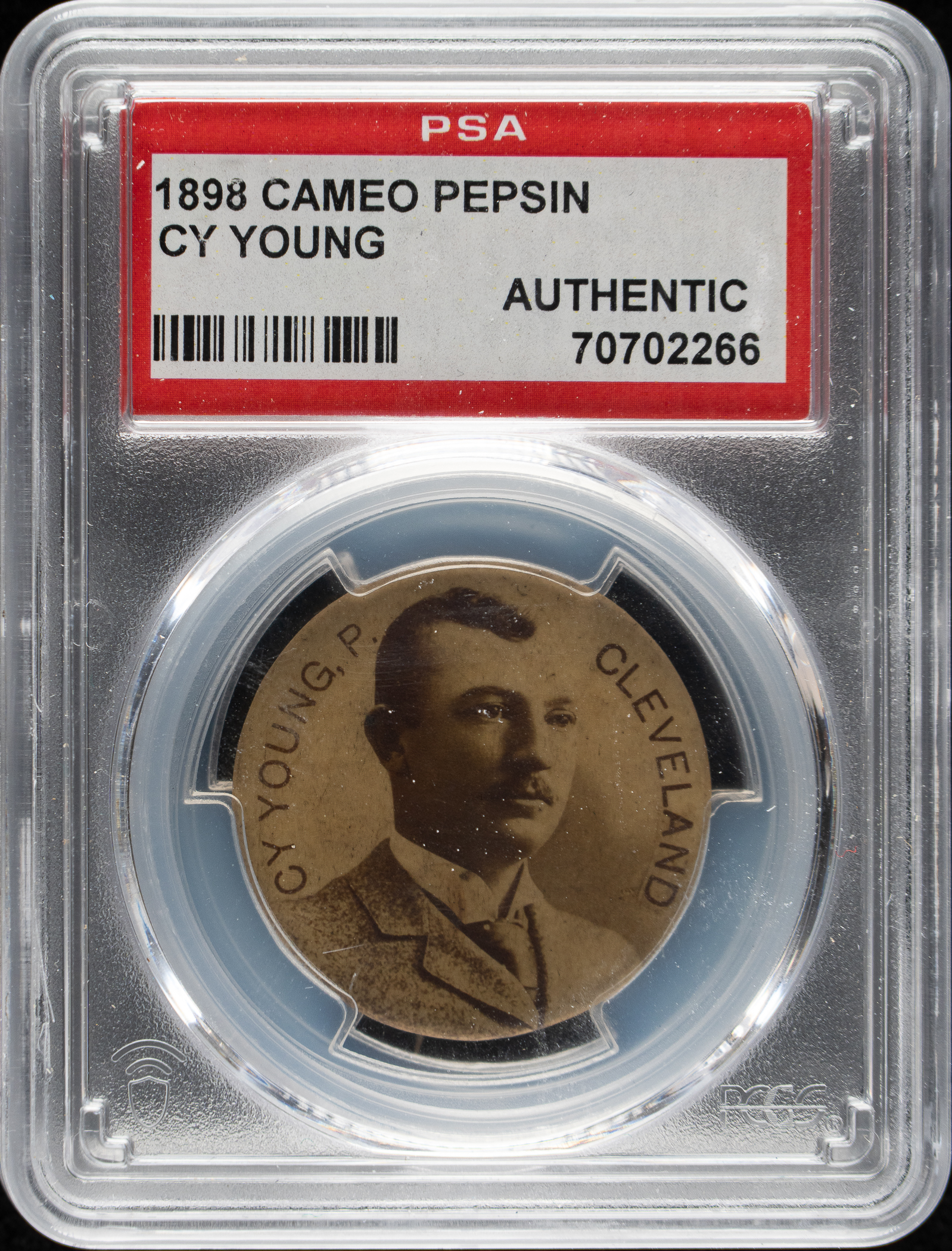 Extremely rare Cameo Pepsin Gum pin featuring Cleveland Hall of Famer Cy Young. An extraordinarily significant rarity, this is only the fourth Young pin we have handled in the past 22 years. This is one of the few issues to depict Young prior to 1900, and he is pictured in portrait wearing a suit and tie. Cameo Pepsin pins, which are manufactured by Whitehead & Hoag, typically feature a wide range of variation in image quality, and the offered example (1.25-inch diameter) displays superb contrast that is significantly better than many other pins (of any player) we've encountered. The original back paper advertising for Cameo Pepsin Gum is missing. Encapsulated as "Authentic" by PSA, this is one of only two examples graded by PSA to date. This is a superb example of this rare pin worthy of even the most advanced collection!
