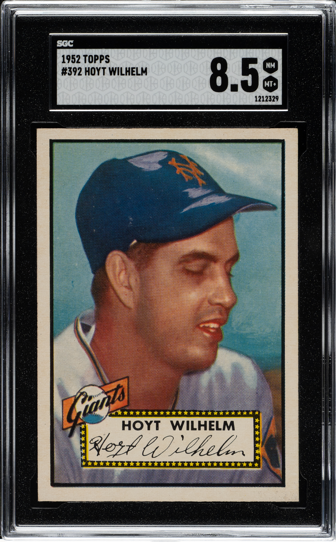 Graded NM/MT+ 8.5 by SGC. Superb high-grade example of New York Giants Hall of Famer Hoyt Wilhelm's rookie card from the rare high-number series of the legendary 1952 Topps set. The offered card has vibrant colors, outstanding registration, crisp white borders, and strong corners. Clean reverse. This card would make an ideal addition to a world-class 1952 Topps set.