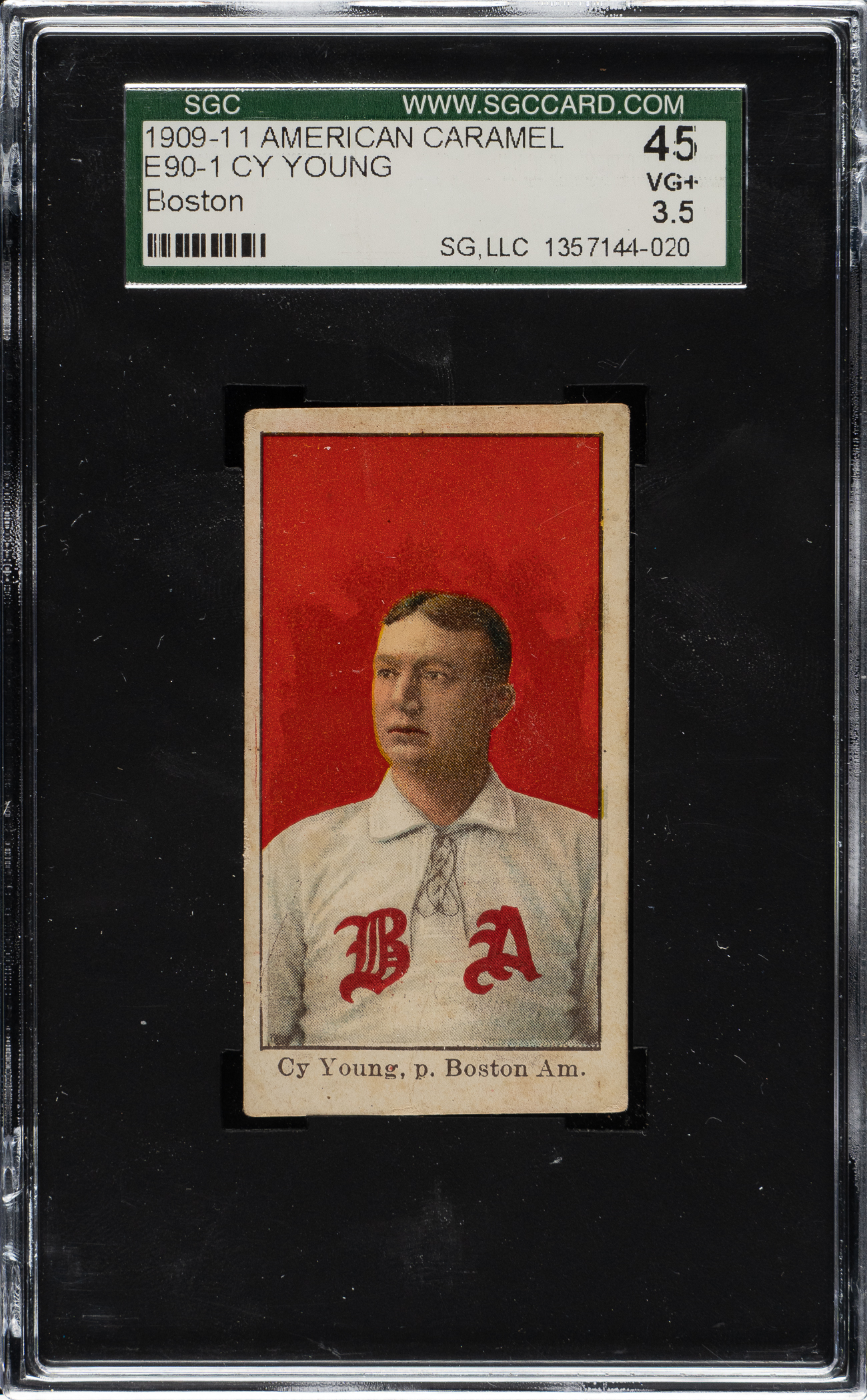 Graded VG+ 45 by SGC. Fantastic example featuring a striking portrait of Hall of Famer Cy Young from the E90-1 American Caramel series. This is easily one of the most popular and classic of all cards of the legendary Young. The offered card has a bold red background, excellent registration, and even corner wear. Boldly printed reverse. A strong mid-grade example of one of the most classic Cy Young cards from the most popular caramel-card set of the era.