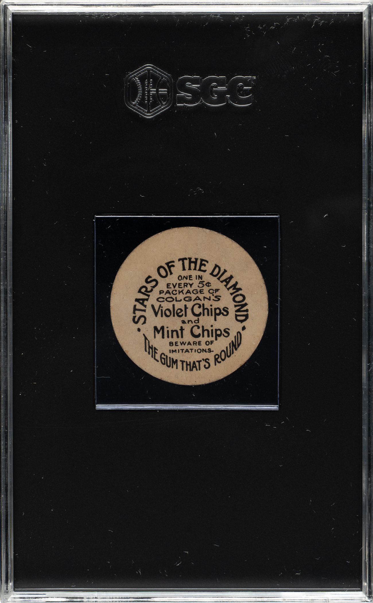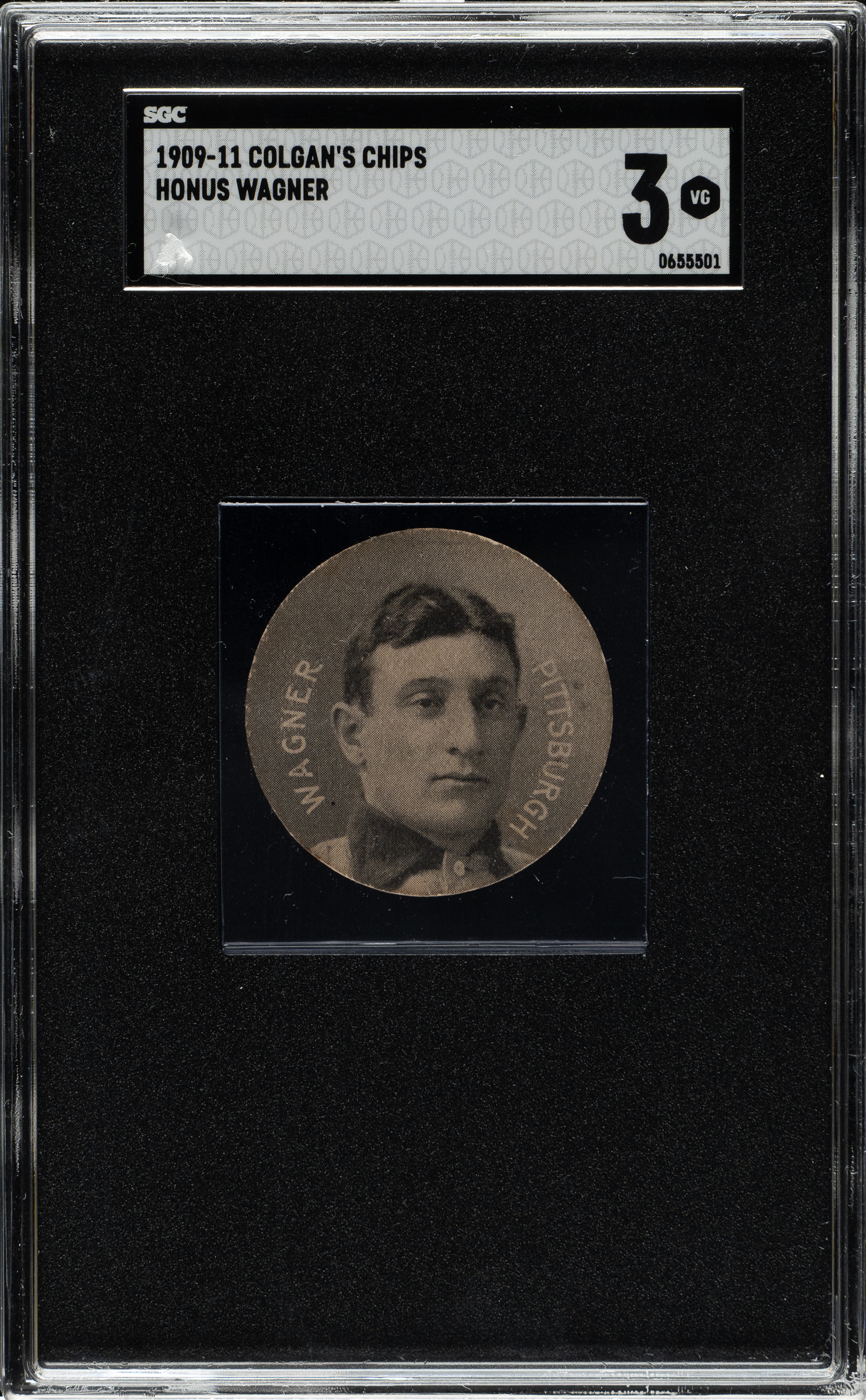 Graded VG 3 by SGC. Very attractive E254 Colgan’s Chips card of Pittsburgh Pirates Hall of Famer Honus Wagner (curved-letters variation). This is one of Wagner's most striking cards, from one of the era's most unusual and interesting sets. This card is also noteworthy as it features the same Carl Horner portrait that appears on Wagner's famous T206 card. Crisp and clean with light wear along the edges. The advertisement along the reverse is boldly printed. Downgraded largely due to a light crease on the left edge (most visible from the back). Wagner is one of the key stars of the set. He has an even greater significance to this set as he was also a spokesman for Colgan’s, allowing his likeness to be used in advertising and promotional materials. This is a very appealing example.