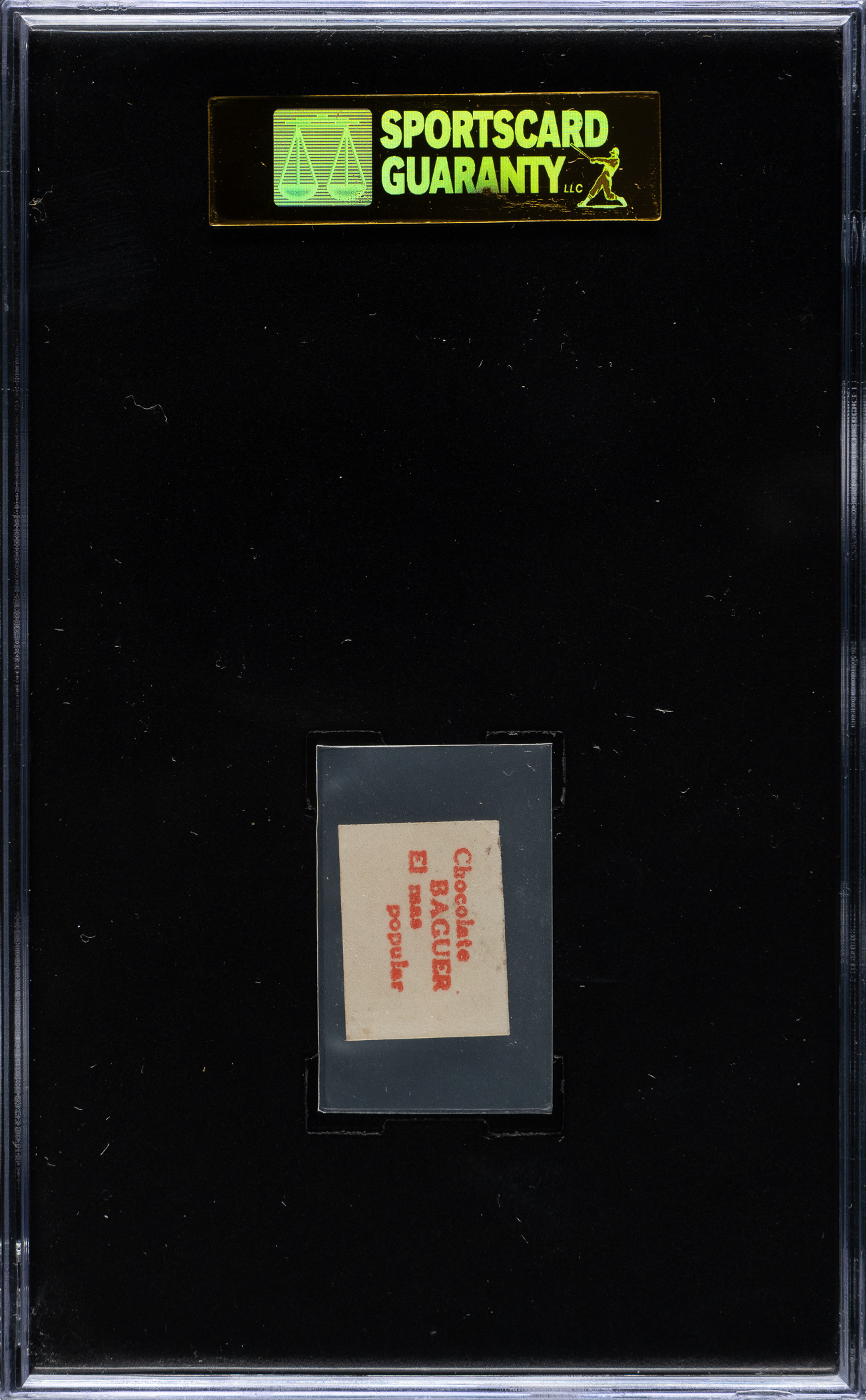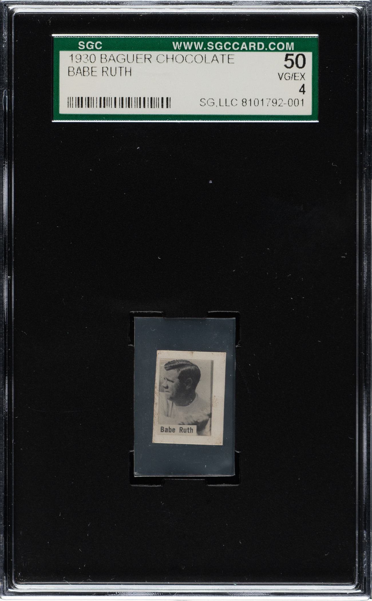Graded VG/EX 50 by SGC. Rarely offered example of legendary New York Yankees Hall of Famer Babe Ruth from the 1930 Baguer Chocolate series. Issued in Cuba in 1930, these small-format black-and-white cards measure 5/8 by 7/8 inches and feature a player photo and name on front surrounded by a white border. Printed in red on the reverse is "Chocolate Baguer El mas popular." Similar to other Cuban issues of the time, an album was designed to house all 90 cards. Upon completion of the set, the full album could be exchanged for valuable prizes, such as candy, sports equipment, or toys. This redemption offer likely contributes to the extreme scarcity of one card, Mitchell Blake, as manufacturers often intentionally printed one card in lesser quantities to minimize their exposure to redemptions. The glossy real-photo stock of these cards, combined with their small size and the fact they were designed to be glued into an album, make high-grade examples from this set particularly rare. The card displays outstanding image quality, light corner wear, and a crease near the upper left corner. Clean reverse. This is an extremely rare card of Babe Ruth from the Baguer Chocolate issue, one of the most fascinating card sets of the era.