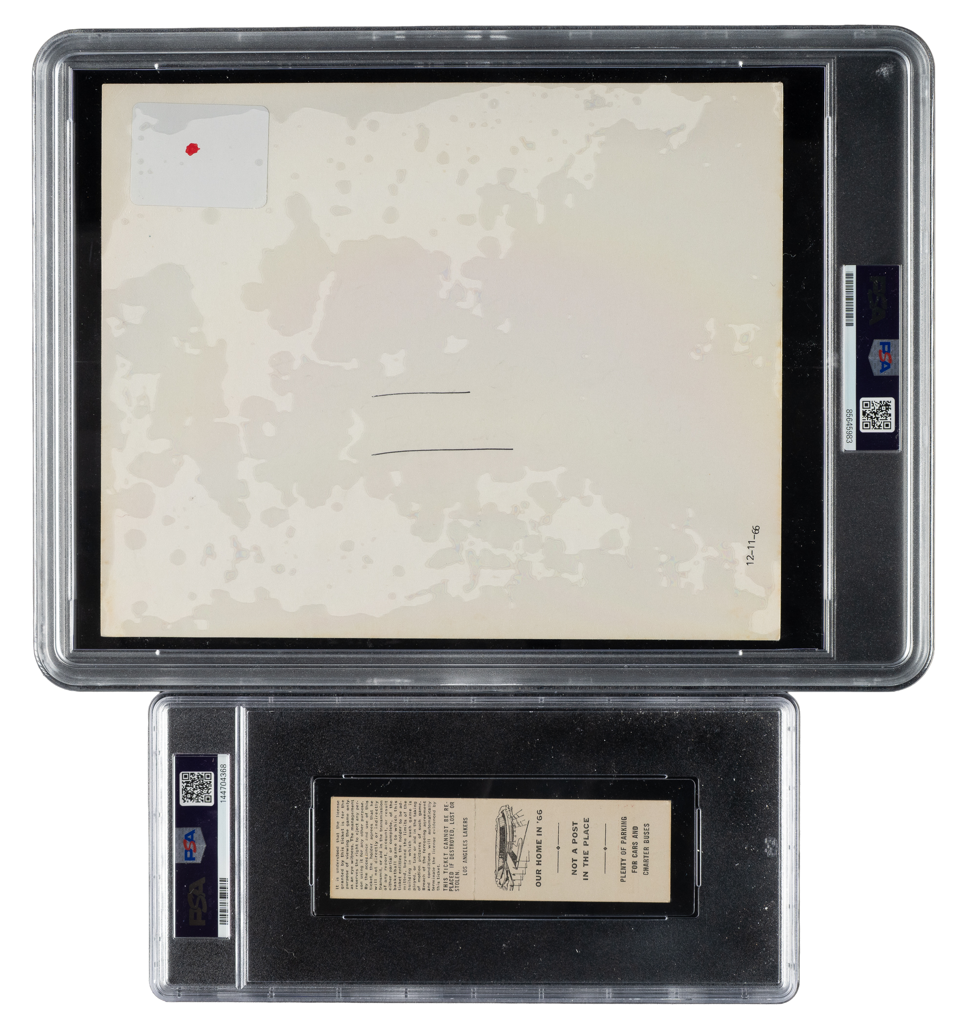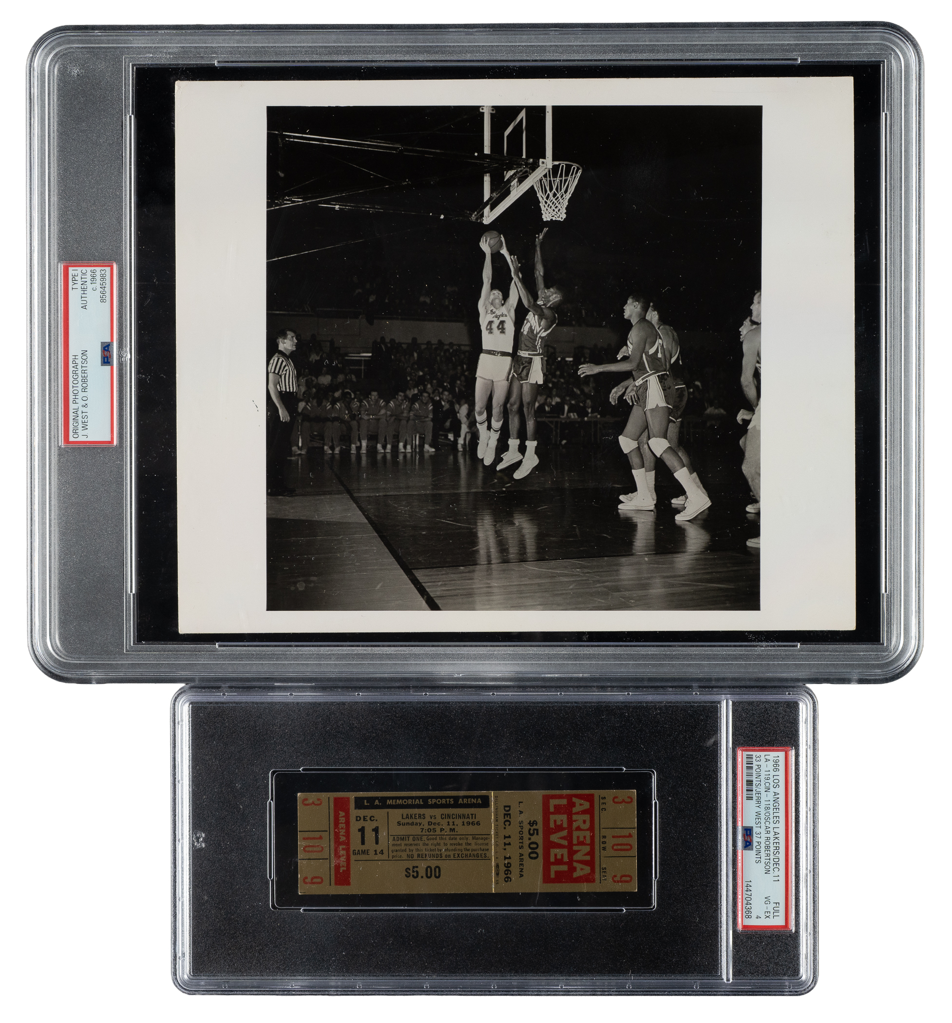 Full ticket (5 x 1.5 inches) issued for a game between the Los Angeles Lakers and Cincinnati Royals on December 11, 1966, at the L.A. Memorial Sports Arena. Graded VG-EX 4 by PSA. Led by Jerry West's 37 points, the Lakers defeated the Royals 119-118. Oscar Robertson scored 33 in the losing effort. The ticket is accompanied by a photo of Robertson contesting West's shot at the basket during that game. Encapsulated and certified as an original Type I photo by PSA/DNA. The photo (10 x 8 inches) is in Very Good to Excellent condition overall. Total: 2 items (ticket and photo).