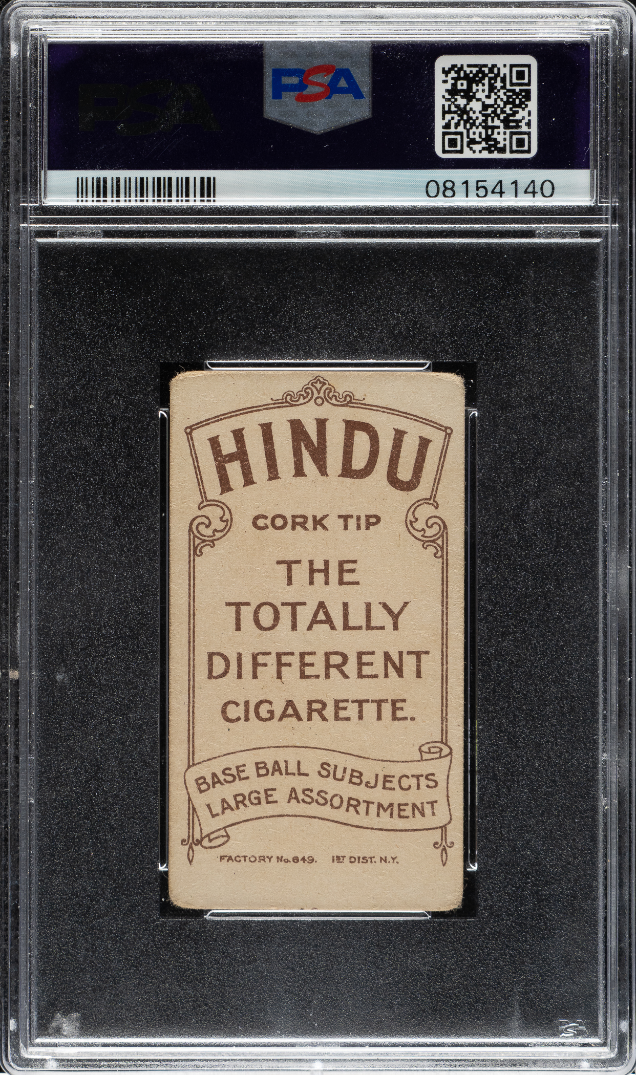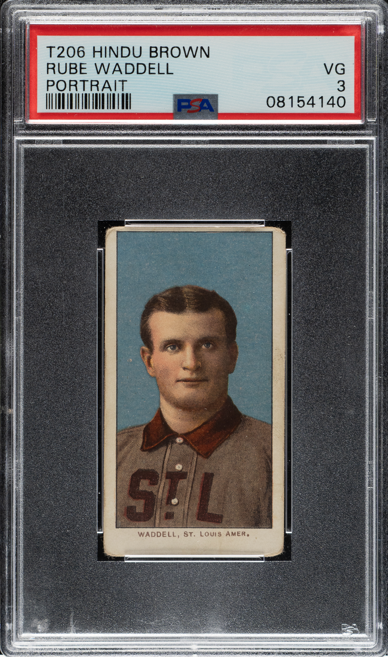Graded VG 3 by PSA. Only two examples of this front/back combination have been graded higher by PSA to date. Very attractive example of St. Louis Browns Hall of Famer Rube Waddell (portrait) featuring a desirable Brown Hindu advertising reverse. This example features bright colors, a crisp image of Waddell, and moderate corner wear. The important advertising reverse is boldly printed and clean.