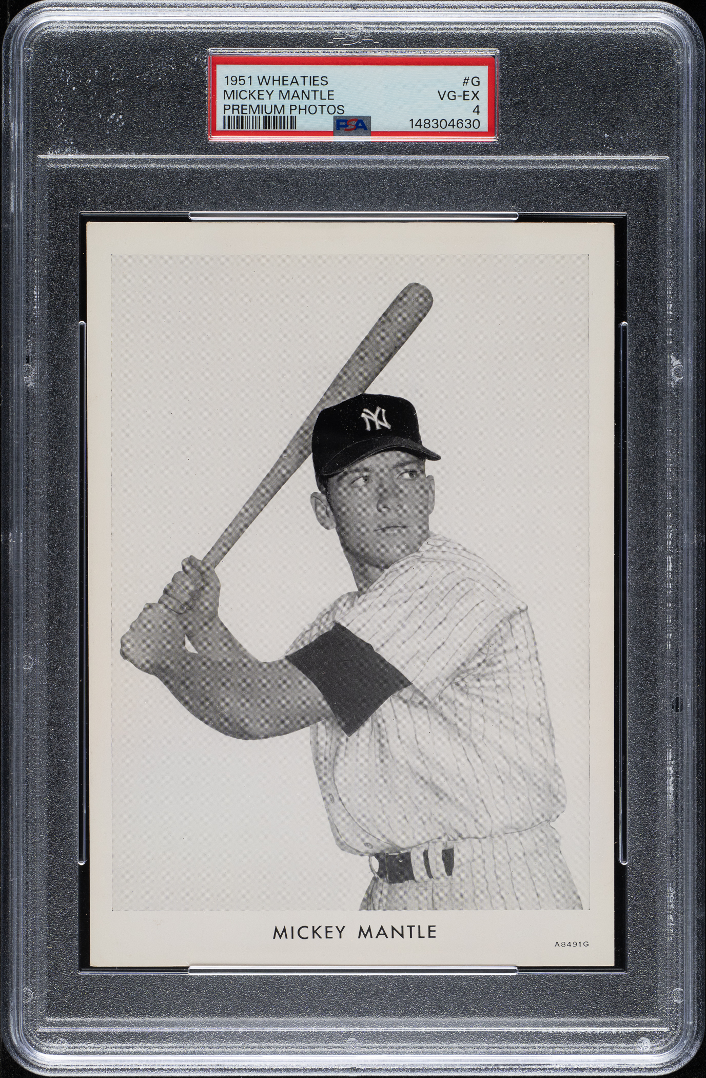 Graded VG-EX 4 by PSA (submitted by REA). Strong mid-grade example of the key card, Mickey Mantle, from the very scarce and unusual 1951 Wheaties premium set. Each glossy premium measures 5 x 7 inches and features an individual star photograph. The Standard Catalog notes "Whether or not these 5" x 7" black-and-white photos were ever issued at all, or only on a test basis is unknown. Despite being unmarked, they are reliably attributed to General Mills, possibly intended for use as a Wheaties premium. The photos found on some of the pictures are the same pictures used on the box-back Wheaties cards of 1952." Our best guess is that these premiums are from an early 1990s find originating directly from the files of General Mills. This speculation is entirely consistent with the fact that, also in the early 1990s, a small number of Mint file copy sets of 1952 Wheaties cards on complete unassembled individual boxes of cereal surfaced that also obviously originated directly from the company. This example features outstanding photo quality and minor wear to the corners. A light discoloration is visible on the blank reverse. This is a striking mid-grade example of the key photo from the set.