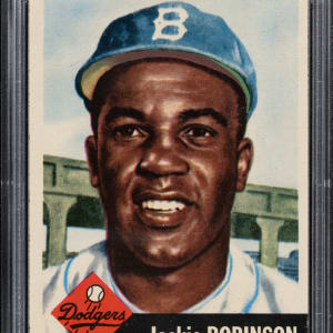 Graded MINT 9 by PSA. Only one example grades higher out of 4,823 cards evaluated to date by PSA. Spectacular ultra-high-grade example of condition-sensitive card #1 Jackie Robinson from the popular 1953 Topps set. This example boasts brilliant colors, excellent registration, crisp white borders, and sharp corners. The reverse is perfectly clean. As the first card in the set, the 1953 Topps Jackie Robinson card tended to be at the top of the stack, exposing it to much more wear than other cards. As a result, high-grade examples are far more difficult to find than most 1953 Topps cards and most other Robinson cards. This is a magnificent example of one of Robinson's most popular cards.