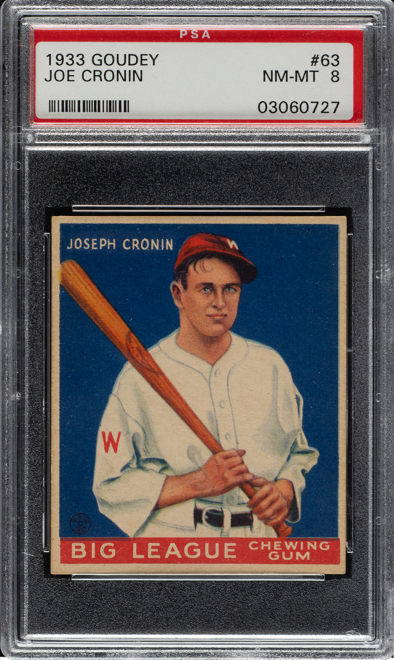 Graded NM-MT 8 by PSA. Only two examples have been graded higher by PSA to date. Superb example of Washington Senators Hall of Famer Joe Cronin from the 1933 Goudey series. This example has brilliant colors, outstanding registration, and strong corners. Clean reverse with bold green text. A fantastic high-grade PSA example.