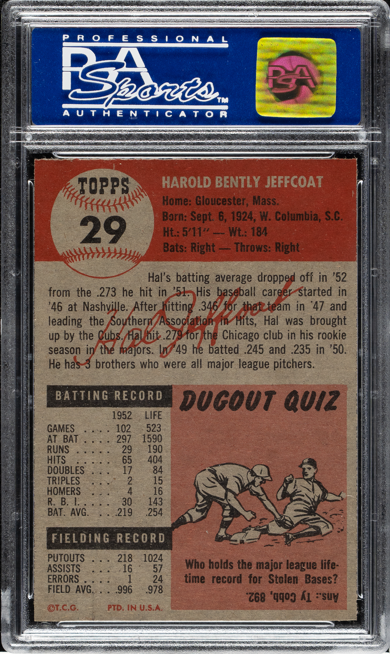 Graded MINT 9 by PSA. Chicago Cubs. One of eight examples graded at this level by PSA with none higher!