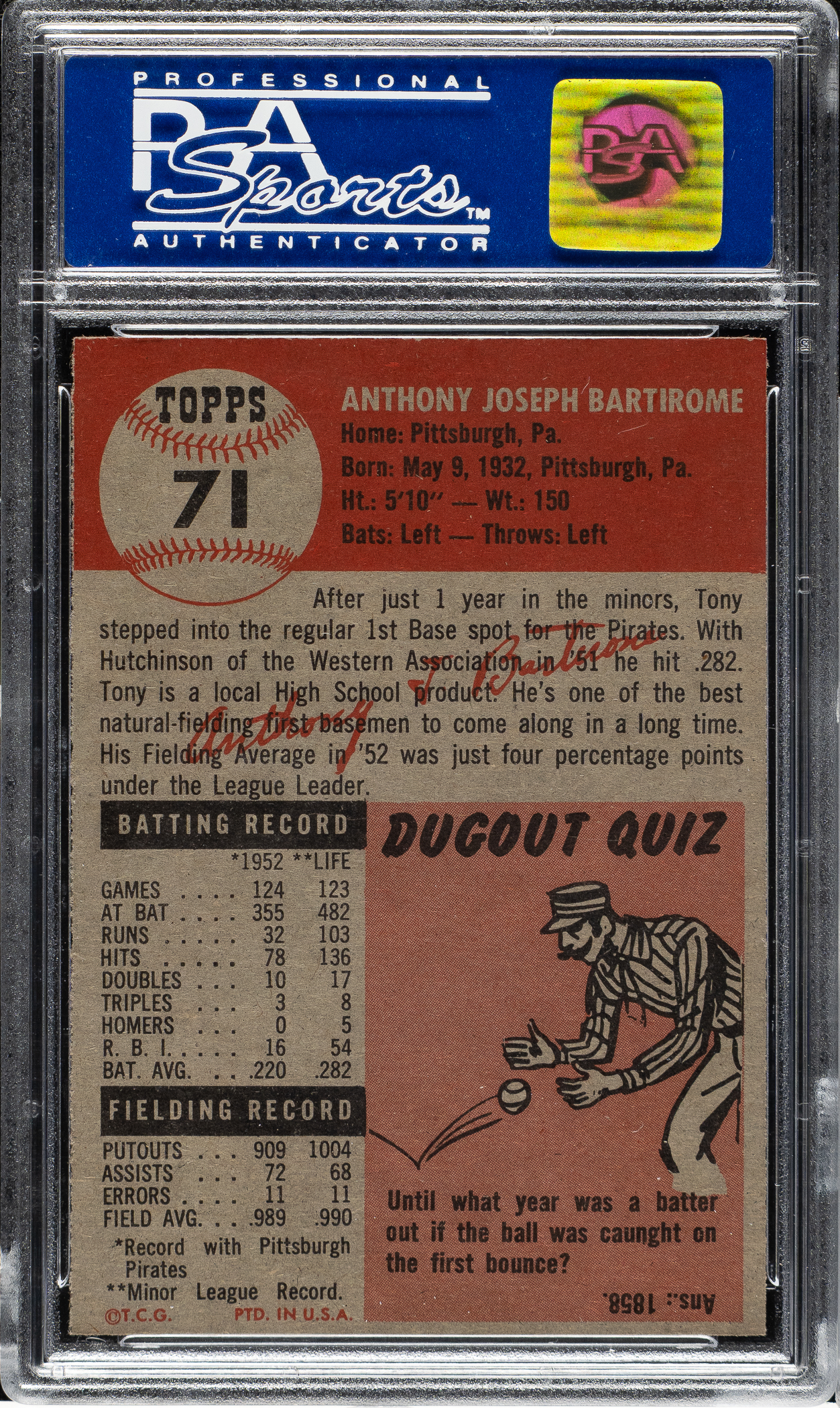 Graded MINT 9 by PSA. Pittsburgh Pirates. One of five examples graded at this level by PSA with none higher!