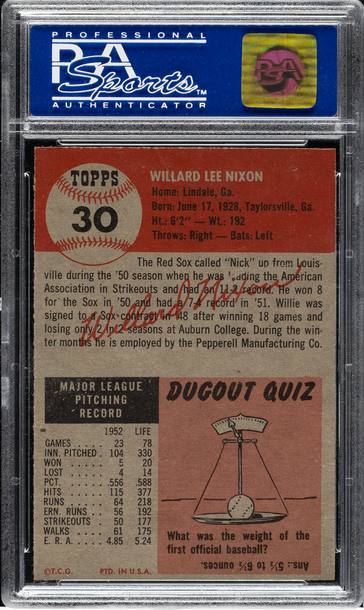 Graded MINT 9 by PSA. Boston Red Sox. One of six examples graded at this level by PSA with none higher!