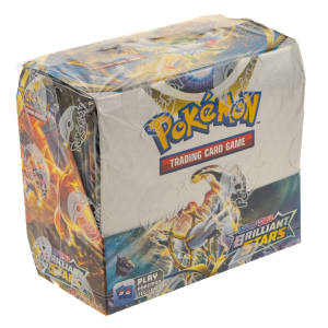 Presented is a 2022 Pokémon Sword & Shield Brilliant Stars factory-sealed unopened booster box that includes 36 packs, each with 11 cards, for a total of 396 cards. The set is highlighted by the Charizard V Alternate (Full Art) card.
