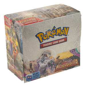 Presented is a 2023 Pokémon Scarlett & Violet factory-sealed unopened booster box that includes 36 packs, each with 11 cards, for a total of 396 cards. The set is highlighted by the Magikarp Illustration Rare card.