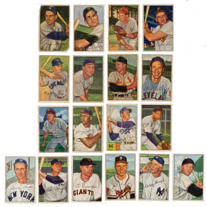 Presented is a near-complete set consisting of 247 different (of 252) 1952 Bowman baseball cards highlighted by many Hall of Famers and stars and missing only #8 Reese, 44 Campanella, 52 Rizzuto, 101 Mantle, and 218 Mays for completion. Condition is 10% Vg-Ex to Ex, 51% Gd to Vg, and 39% Pr to Fr (including one altered, one trimmed, and a couple that measure a bit small). Keys: #1 Berra (Pr), 2 Thomson (Gd), 4 Roberts (Fr), 5 Minoso RC (Fr), 11 Kiner (Vg), 21 Fox (Gd+), 23 Lemon (Fr), 30 Schoendienst (Fr), 43 Feller (Pr), 53 Ashburn (Fr), 80 Hodges (Vg), 115 Doby (Pr), 116 Snider (Pr), 142 Wynn (Fr), 145 Mize (Vg), 146 Durocher (Gd), 156 Spahn (Fr), 162 Irvin (Vg-Ex), 196 Musial (Fr), 217 Stengel (Pr), 232 Slaughter (Vg), and 252 Crosetti (Gd). A very presentable medium- to lower-grade near-complete set of this classic Bowman issue. Total: 247 cards.