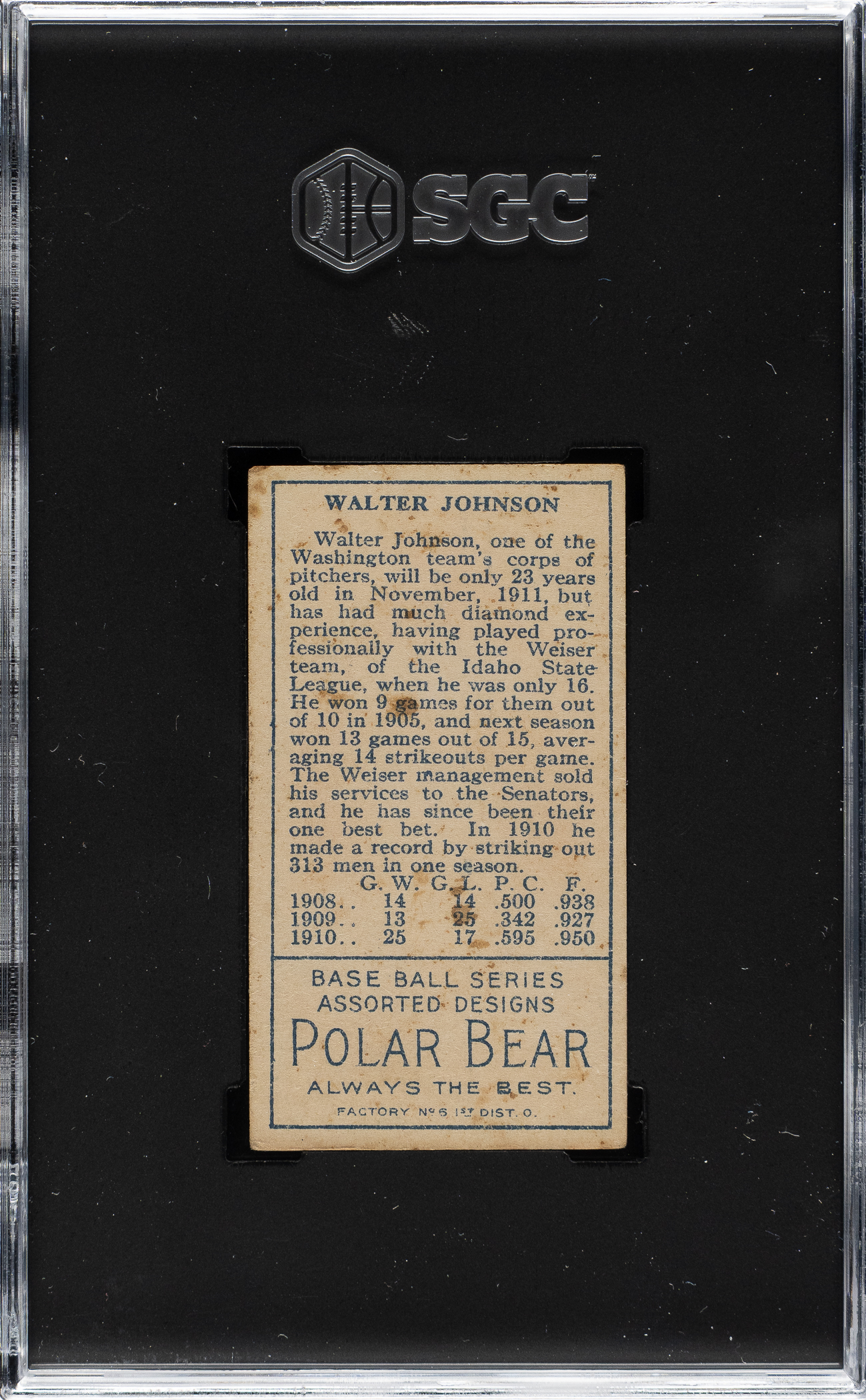 1909-1911 T206 White Border Walter Johnson Hands at Chest SGC Authentic - Sovereign 350 Back