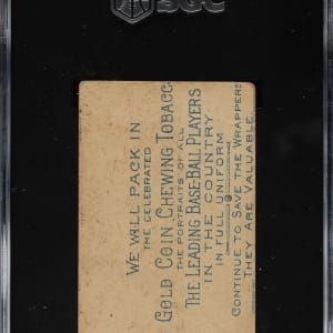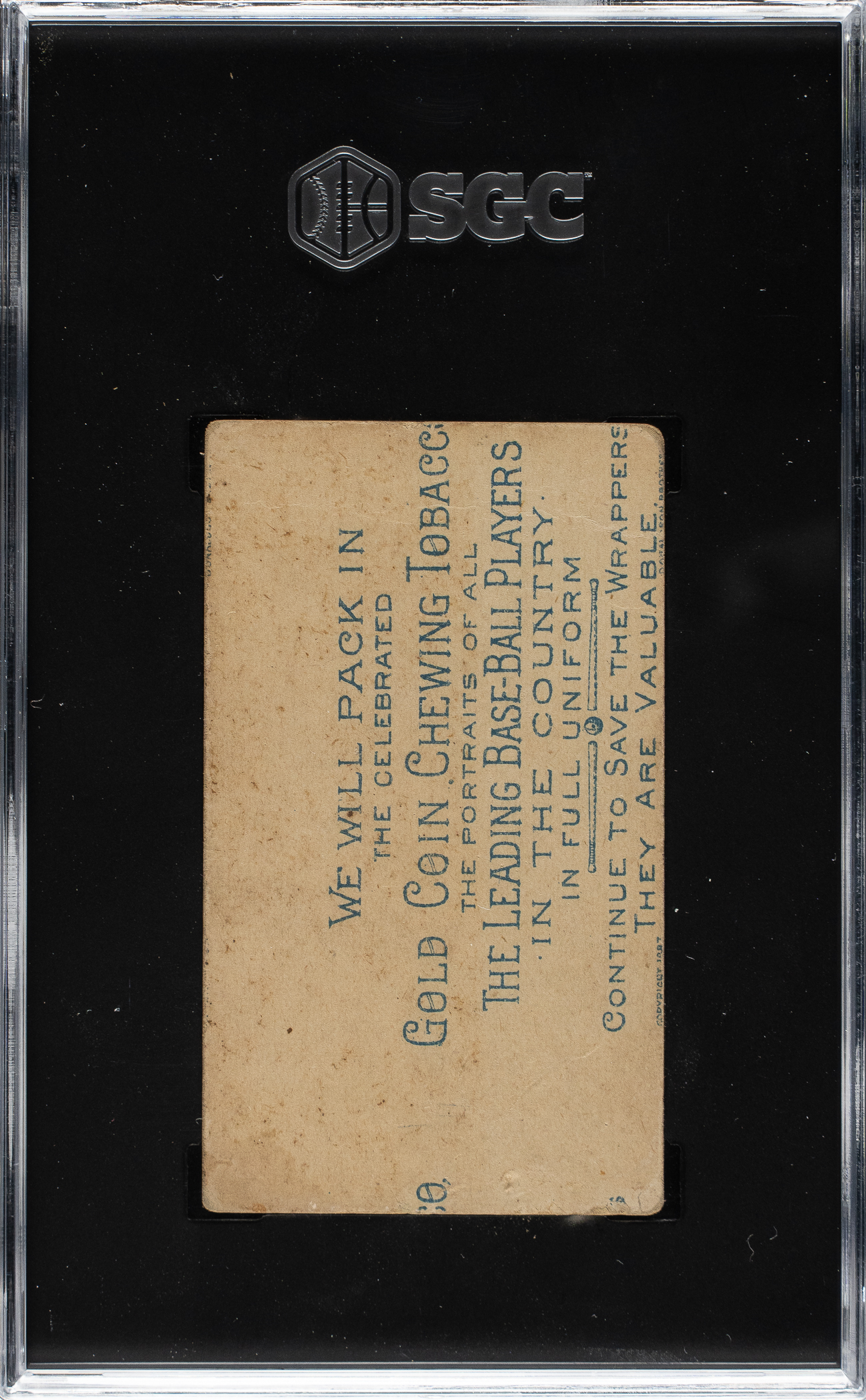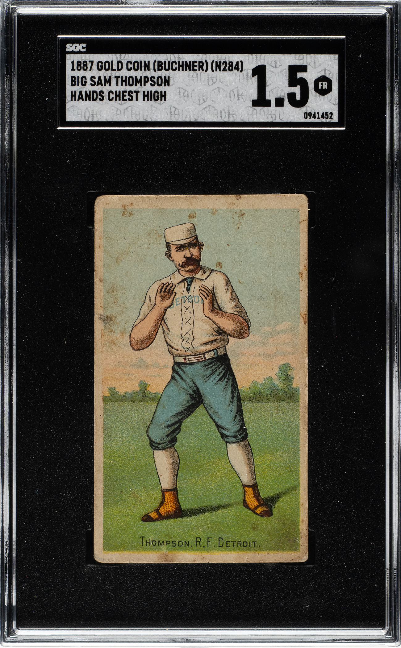 Very presentable example of Detroit Wolverines Hall of Famer Sam Thompson (hands chest high pose) from the popular N284 Buchner Gold Coin set. Bright and crisp with bold colors, a strong image, and honest corner wear. Graded FAIR 1.5 by SGC largely due to light creasing and scattered foxing front and back. The advertising text on the reverse is slightly miscut. Buchners are unusual in that they feature generic illustrations of the ballplayers rather than the actual likeness of the identified player. This is a visually appealing Hall of Famer example from the Buchner Gold Coin tobacco set, one of the few full-color baseball-card sets of the nineteenth century and one of the most artistically interesting, distinctive, and classic baseball-card sets of the 1880s.
