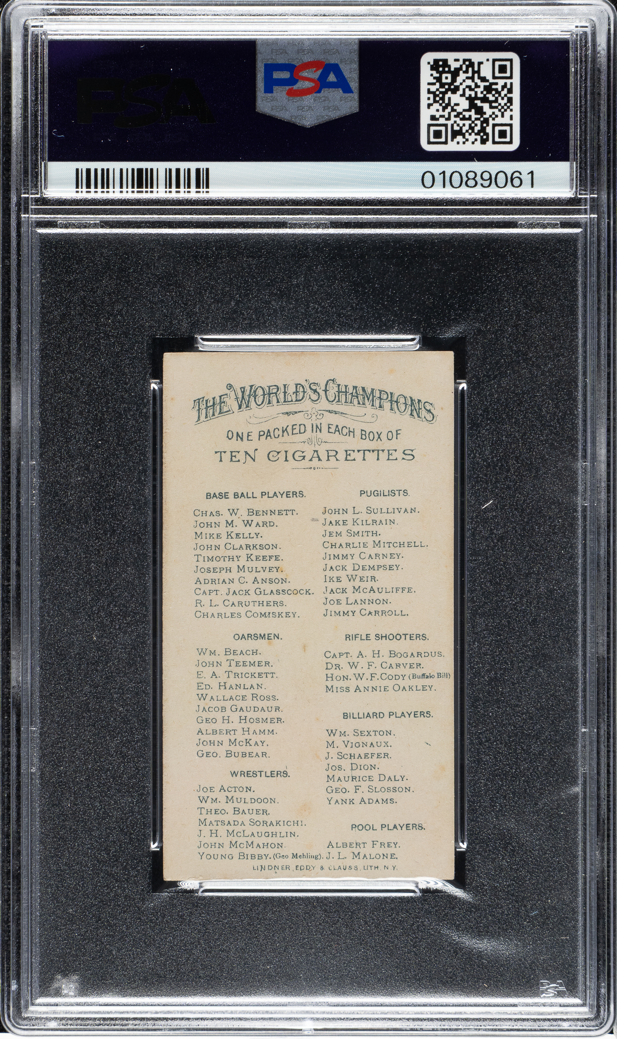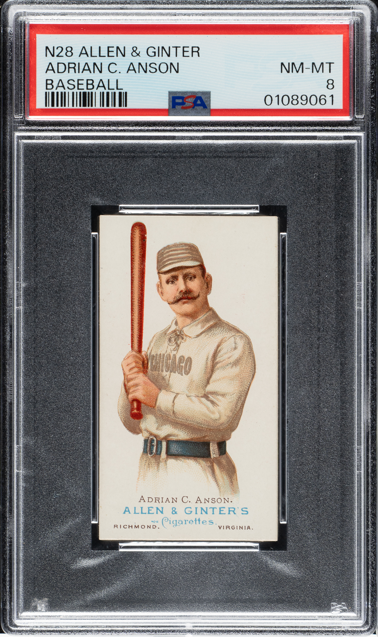 Graded NM-MT 8 by PSA. Only three examples graded higher by PSA. Beautiful high-grade example of Chicago White Stockings Hall of Famer Cap Anson, the key card from the popular N28 Allen & Ginter "World's Champions" series. N28 Allen & Ginter "World's Champions" are considered by many to be the most beautiful of all 19th century tobacco-card issues. This example has bold colors, a crisp image, and strong corners. Boldly printed checklist reverse. Cards from the 19th century are rarely found this sharp. A tremendous high-grade example of one of the most classic of all 19th century baseball cards.