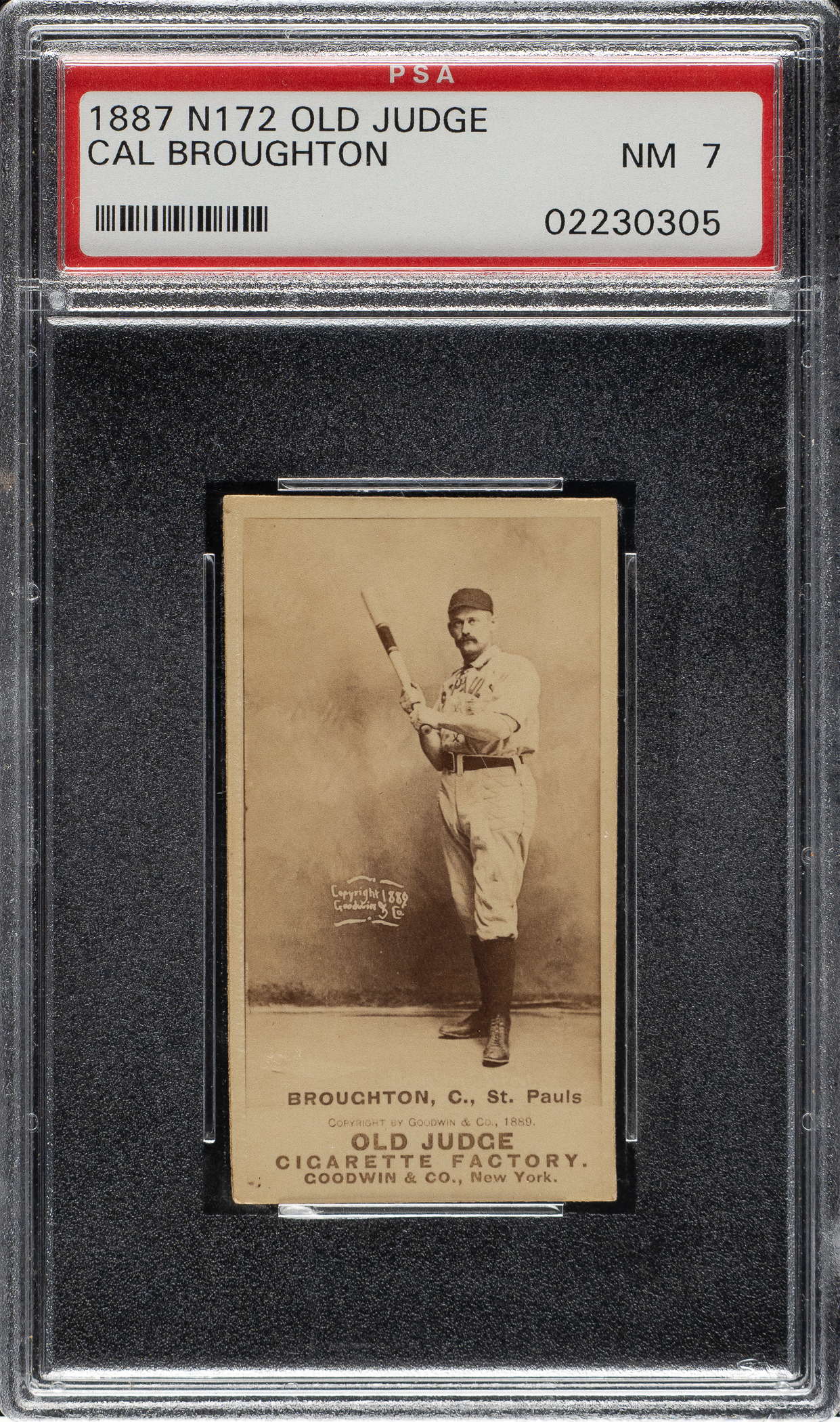 Graded NM 7 by PSA. This is the ONLY example graded at this level by PSA with none higher! Outstanding high-grade 1889 N172 Old Judge example of Cal Broughton (pose #42-1) with the St. Paul Apostles. This is an ideal sample. The offered card has superb photo quality and strong corners. The blank reverse is entirely clean. This is a striking high-grade example from the most important of all 19th century sets.