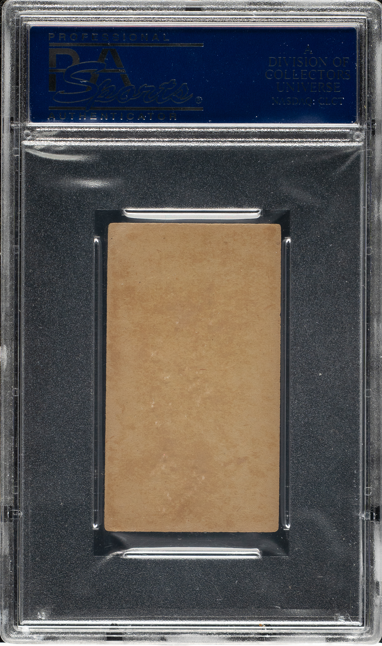 Graded VG-EX 4 by PSA. Striking example of this particularly rare and distinctive N172 portrait pose (with bowler hat) of Indianapolis Hoosiers manager George Walter "Watch" Burnham (#55-1, the only pose of Burnham featured in the series). This is also an extremely rare card in the Old Judge set, as well as being a particularly desirable portrait card. Burnham managed the Hoosiers of the National League for only twenty-eight games in 1887. Before managing the Hoosiers, he was a major league umpire in the National League. In 1883, he called balls and strikes for a no-hitter thrown by "Old Hoss" Radbourn. Legend has it that he got his nickname ("Watch") when it was discovered that a gold presentation watch that was given to him was actually arranged to be presented and was paid for by Burnham, and was not the generous gift of admiration and respect that he led others to believe. The offered example has light wear on the corners and, as is often the case with Old Judges, the picture is a little light. The blank reverse has light toning. This is a striking and extremely rare N172 Old Judge pose.