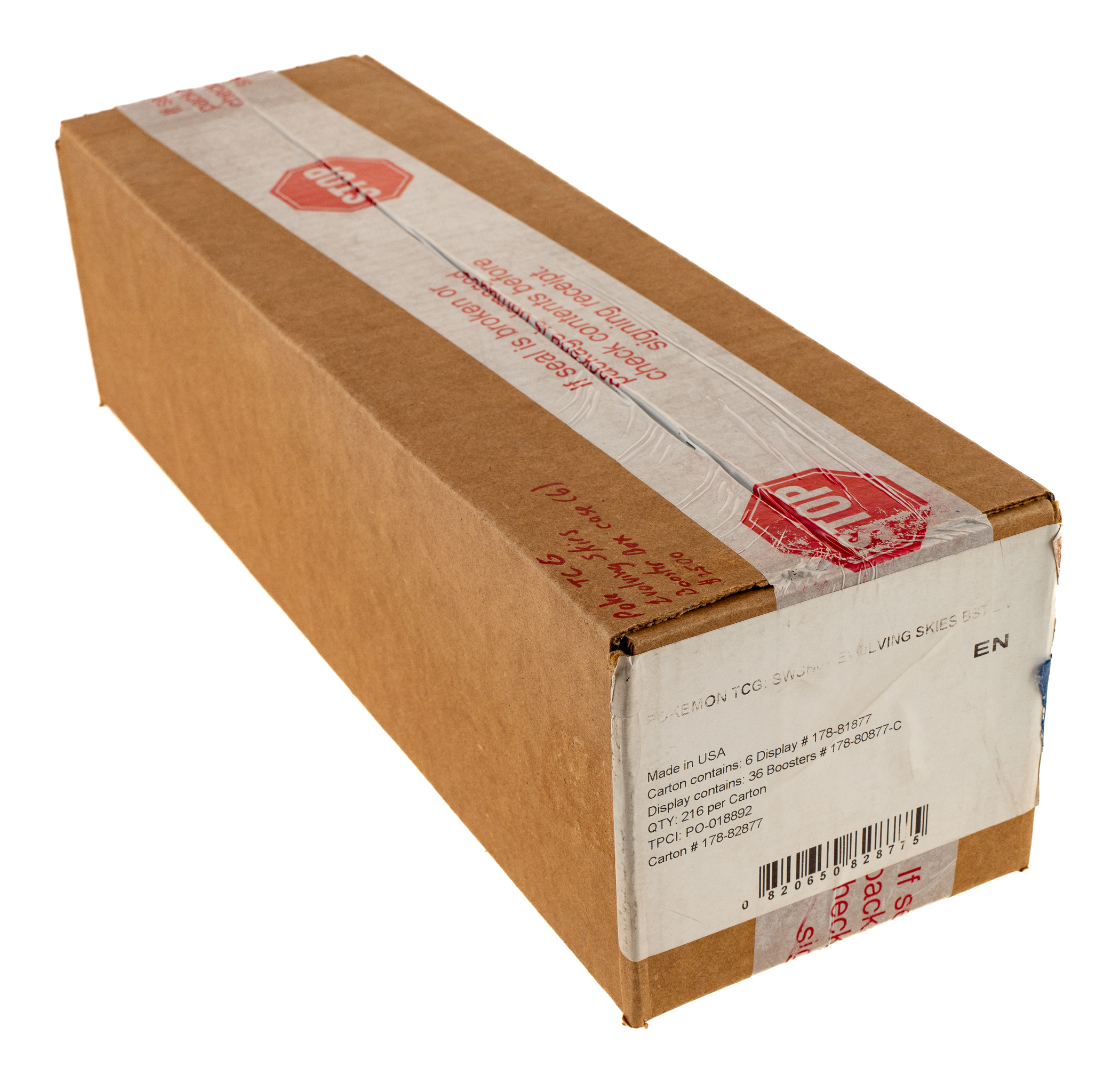 Extremely desirable factory-sealed booster box case from the 2021 Pokémon Sword & Shield Evolving Skies series. The case contains six unopened boxes, with 36 packs per box for a total of 216 packs. The 237-card Evolving Skies set is particularly significant in the Pokémon community as it features several of the most popular Eeveelution cards in existence, including the iconic Umbreon VMAX (Alternate Art), famously known as "Moonbreon" in the collecting community. Other notable Pokémon with desirable cards in the series include Dragonite and Rayquaza. The original outer case displays minimal wear. The size/weight of this item requires that there will be an additional shipping charge for this lot.
