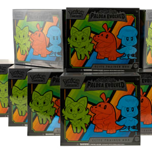 Collection of 10 factory-sealed Elite Trainer boxes of 2023 Pokémon Scarlet & Violet Paldea Evolved, representing a complete case. Each box contains nine packs for a total of 90 packs. Accompanied by the original outer case. Total: 10 factory-sealed trainer boxes. The size/weight of this item requires that there will be an additional shipping charge for this lot.
