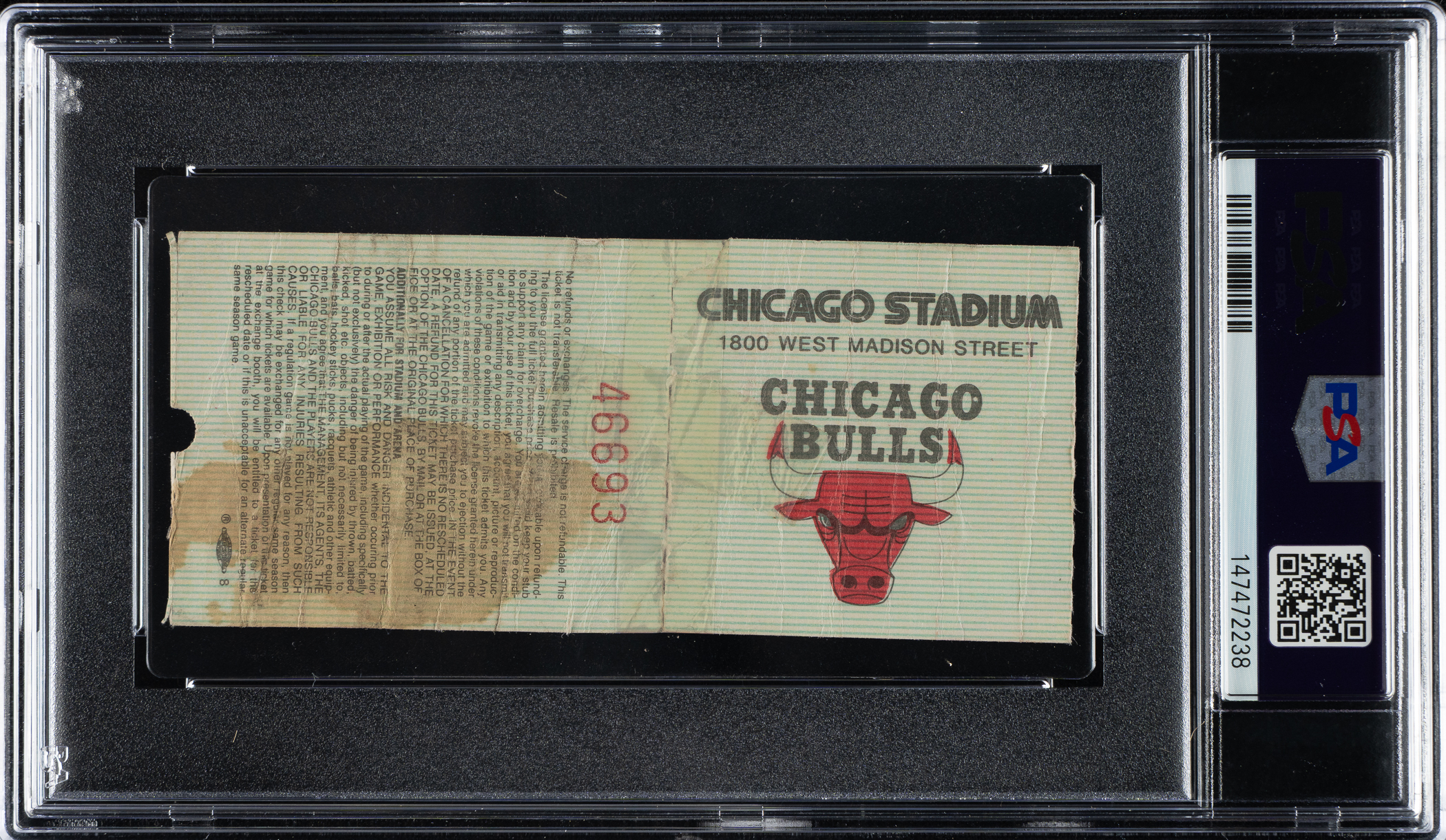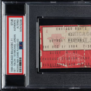 Ticket stub (4.5 x 2 inches) issued to a December 11, 1984, game between the Chicago Bulls and Detroit Pistons at Chicago Stadium. Encapsulated as Authentic Altered by PSA due to tape repairs on the reverse. The Pistons defeated the Bulls 108-101 despite 27 points from Michael Jordan, who was playing in just his 23rd career game.