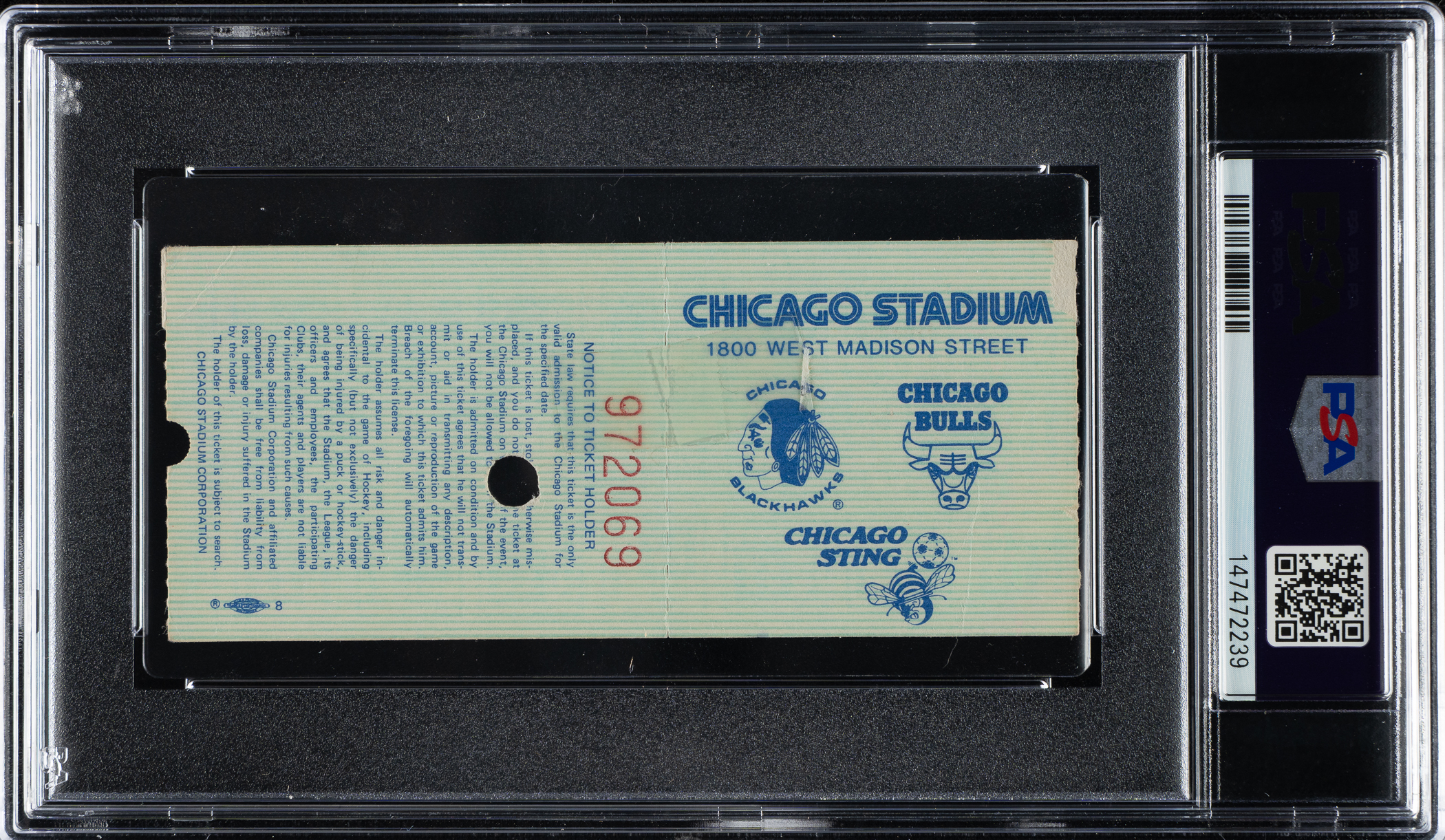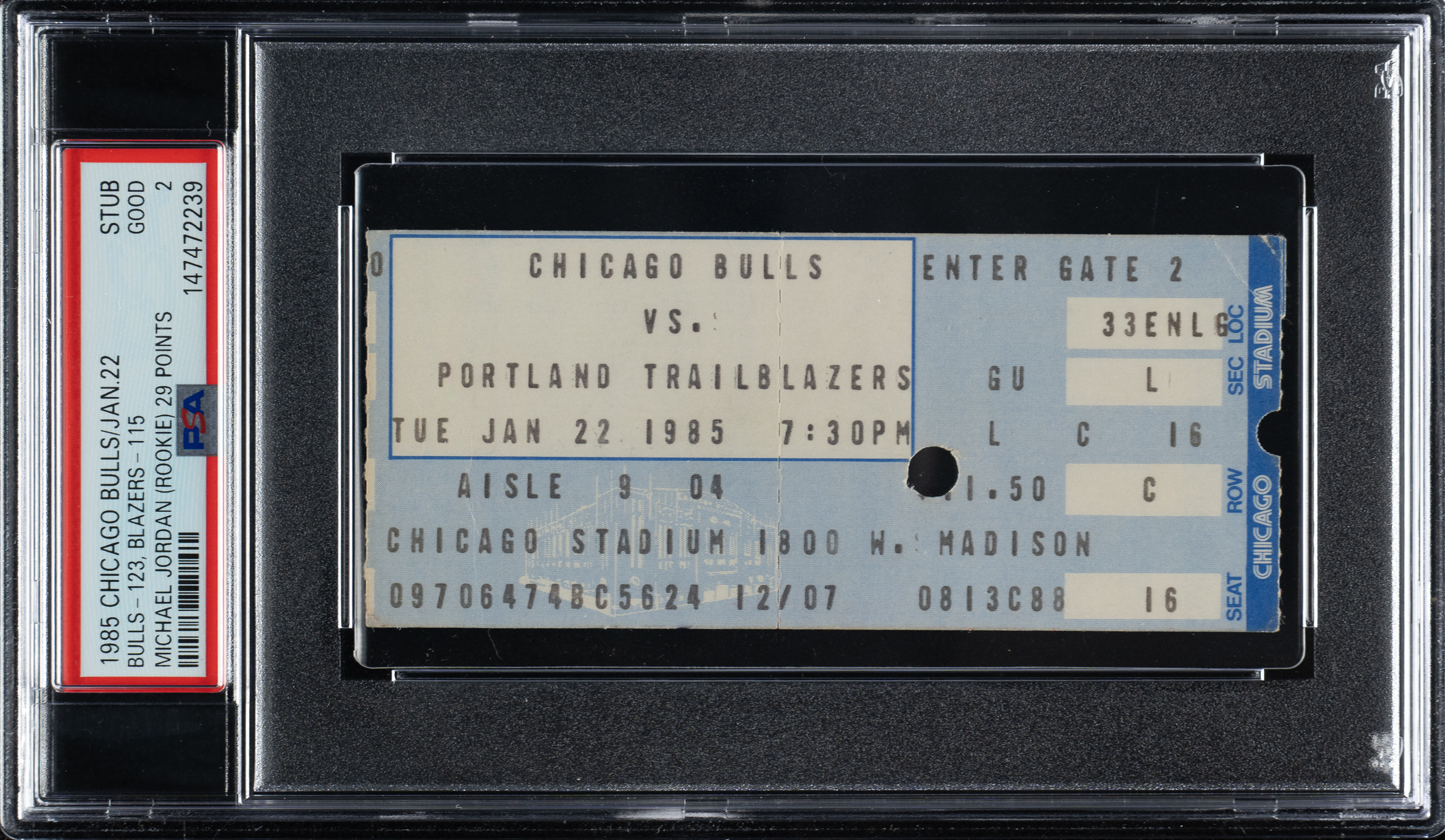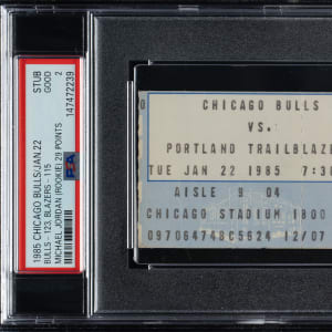 Graded GOOD 2 by PSA. Ticket stub (4.5 x 2 inches) issued to a January 22, 1985, game between the Chicago Bulls and Portland Trail Blazers at Chicago Stadium. The Bulls defeated the Trail Blazers 123-115 behind Michael Jordan's 29 points, 12 rebounds, and 5 assists.