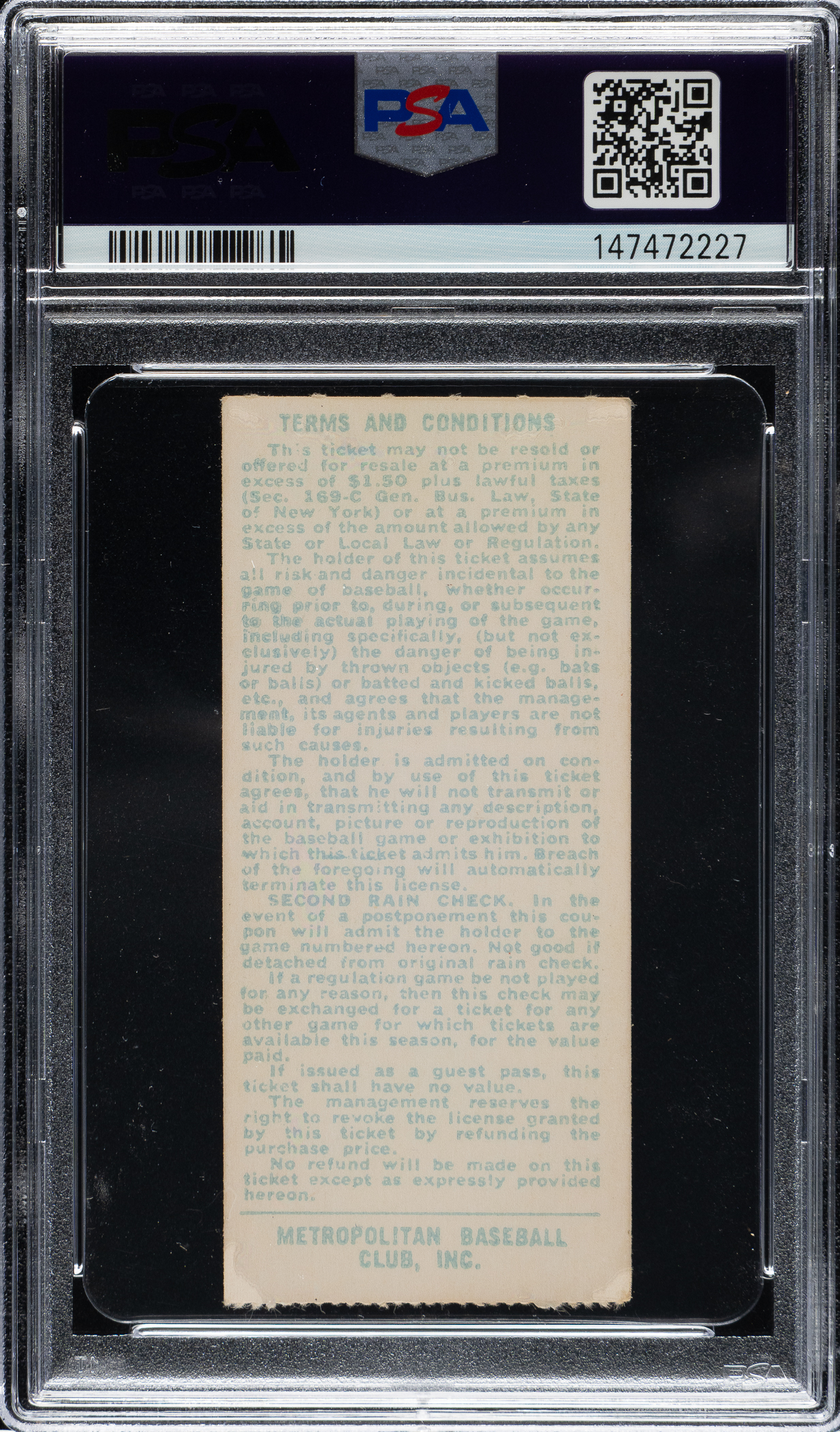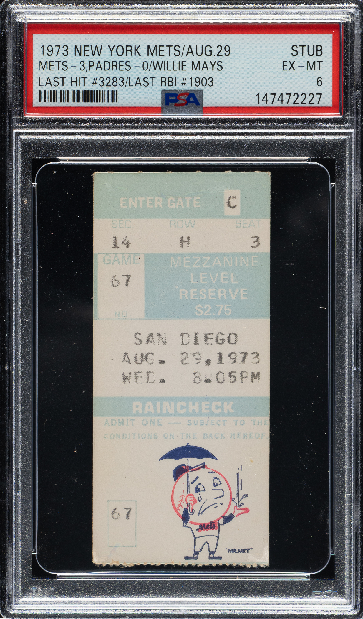 Graded EX-MT 6 by PSA. This is the ONLY example graded at this level by PSA with none higher! Ticket stub (1.5 x 3.25 inches) issued to an August 29, 1973, game between the New York Mets and San Diego Padres at Shea Stadium. Willie Mays recorded his last career regular-season hit and RBI in the Mets' 3-0 win.