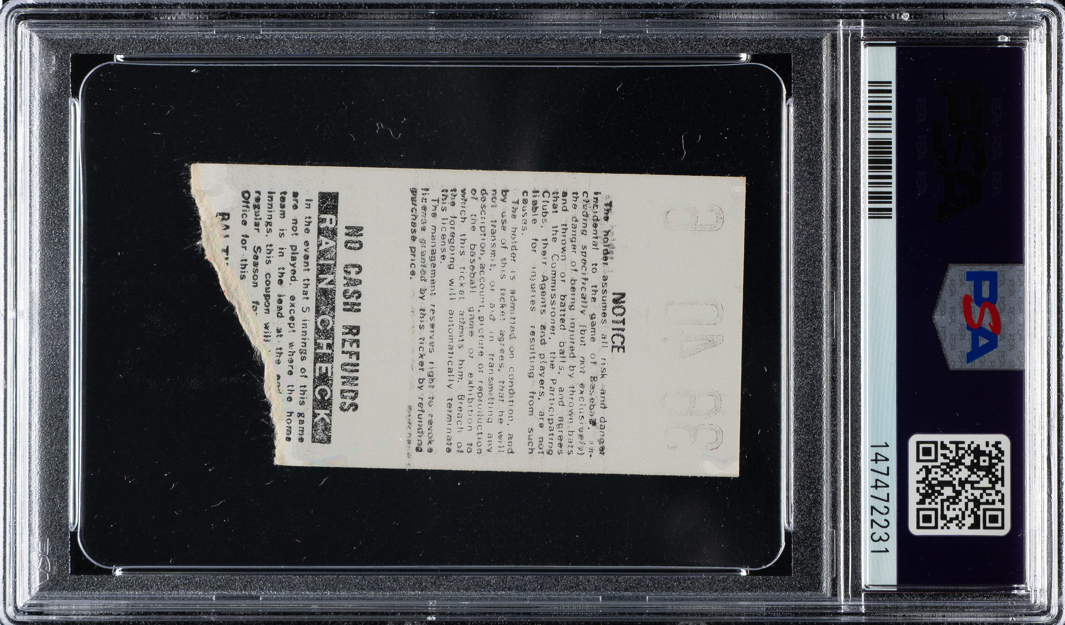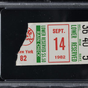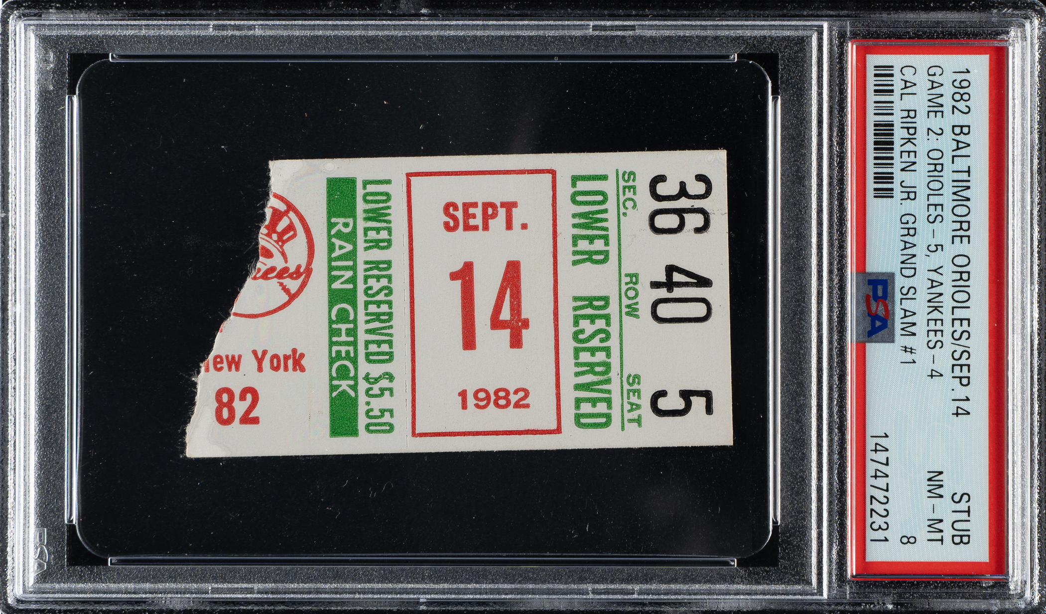 Graded NM-MT 8 by PSA. One of only two examples graded at this level by PSA with none higher! Ticket stub (1.5 x 2.75 inches) issued to the second game of a doubleheader on September 14th, 1982, between the Baltimore Orioles and New York Yankees at Camden Yards in Baltimore. Cal Ripken Jr. blasted his first career grand slam as his Orioles downed the Yankees 5-4.