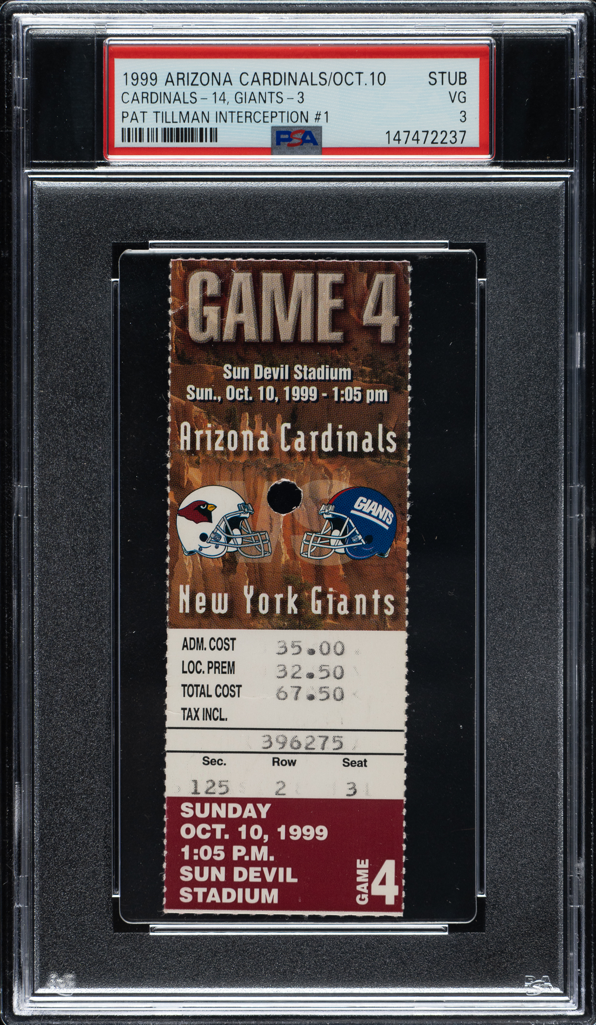 Ticket stub (1-5/8 x 4-5/8 inches) issued for a game between the Arizona Cardinals and New York Giants at Sun Devil Stadium in Tempe, Arizona. Graded VG 3 by PSA, this is the ONLY example certified by PSA! The Cardinals defeated the Giants 14-3 as Arizona's Pat Tillman recorded his first career interception. Following the 2001 season, Tillman left the Cardinals to join the United States Army Special Operations. He was killed in Afghanistan by friendly fire on April 22, 2004. Tillman posthumously received the Silver Star and Purple Heart medals. Additionally, the Cardinals retired his number 40.