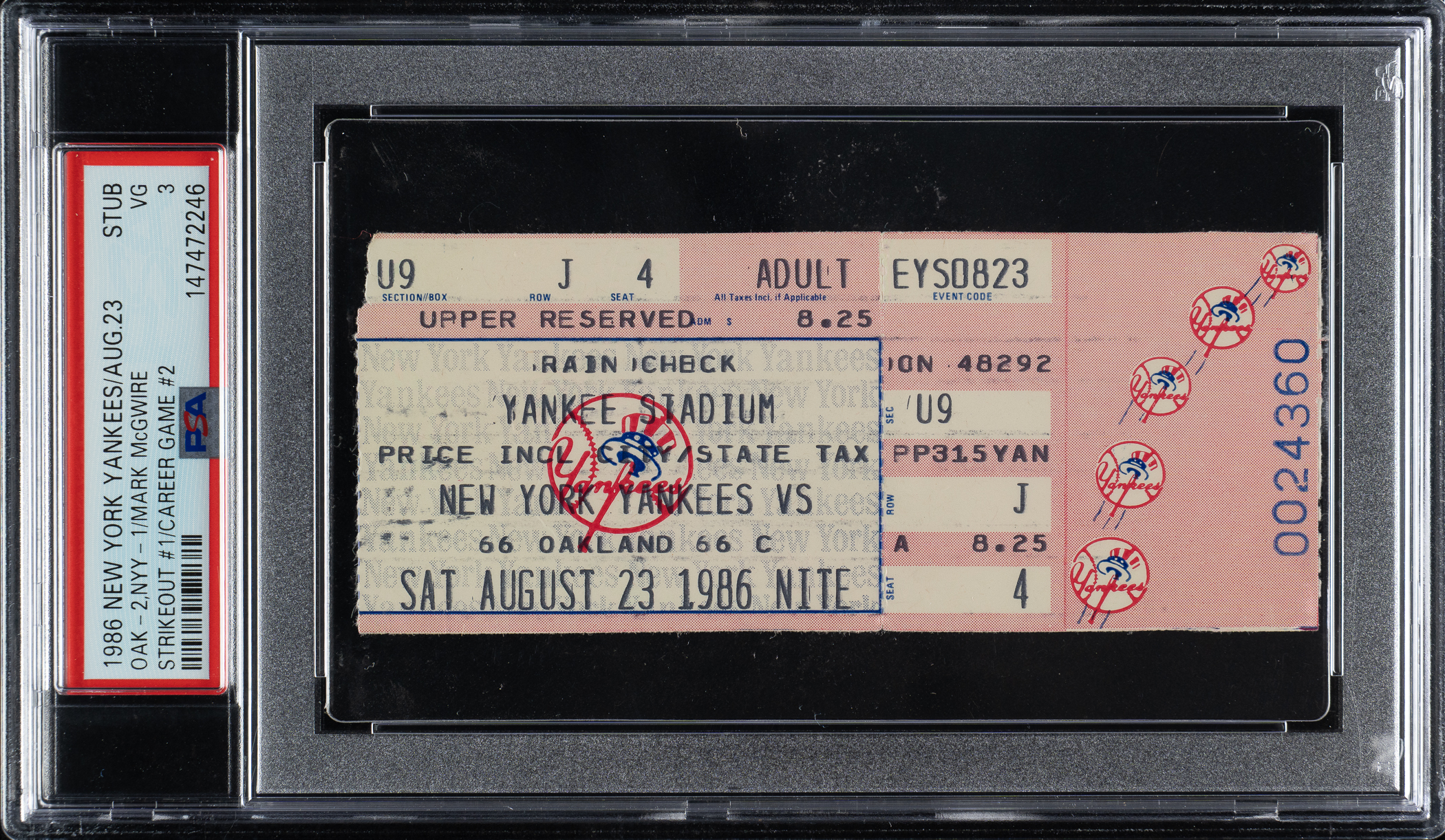 Ticket stub (4.75 x 2 inches) issued for an August 23, 1986, game between the New York Yankees and Oakland Athletics at Yankee Stadium. Graded VG 3 by PSA, this is one of only two examples certified by PSA and the highest graded! Curt Young pitched eight strong innings as the Athletics defeated the Yankees 2-1. Oakland's Mark McGwire, playing in just his second Major League game, struck out twice.