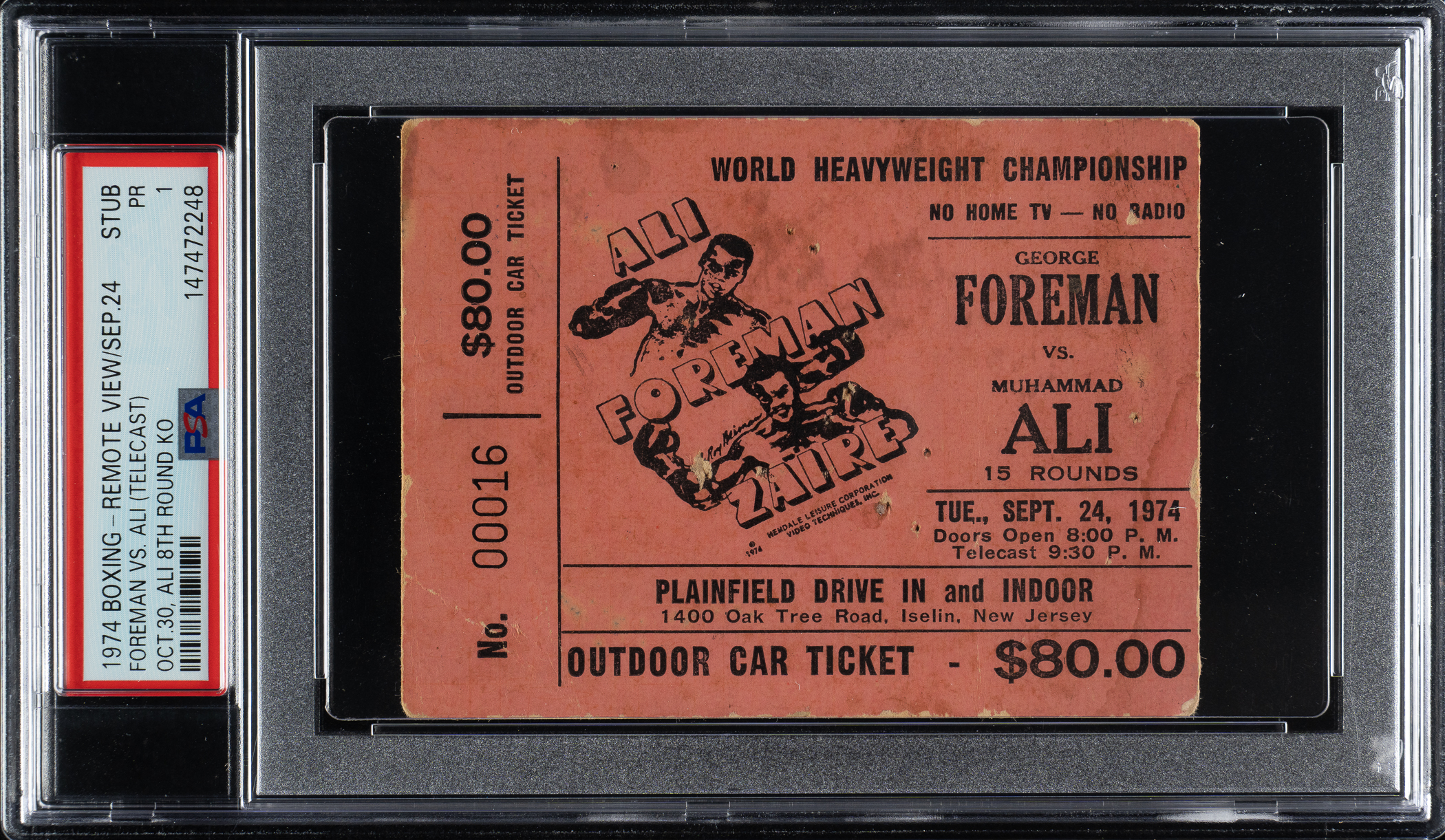 Ticket stub (4 x 3 inches) issued to a remote viewing party scheduled for September 24, 1974, in Iselin, New Jersey, for the heavyweight title fight between Muhammad Ali and George Foreman. Graded POOR 1 by PSA, this ticket is a very rare "$80 car ticket" variation. The famed "Rumble in the Jungle" was ultimately rescheduled for October 30, 1974, in Kinshasa, Zaire. The fight was one of the defining moments of Ali's illustrious career. Matched against Foreman, who was coming off a dominating victory over Joe Frazier (one of Foreman's blows actually lifted Frazier off the canvas), Ali was given little chance by many pundits of regaining the heavyweight title. Undaunted by critics and buoyed by the support of the local fans, who constantly chanted "Ali Bomaye!" ("Ali kill him"), Ali shocked the world by registering an eighth-round knockdown of Foreman. His victory came in large part from his use of the famous "Rope-a-Dope," a strategy of letting Foreman tire himself out by pounding on him while he remained covered up on the ropes.