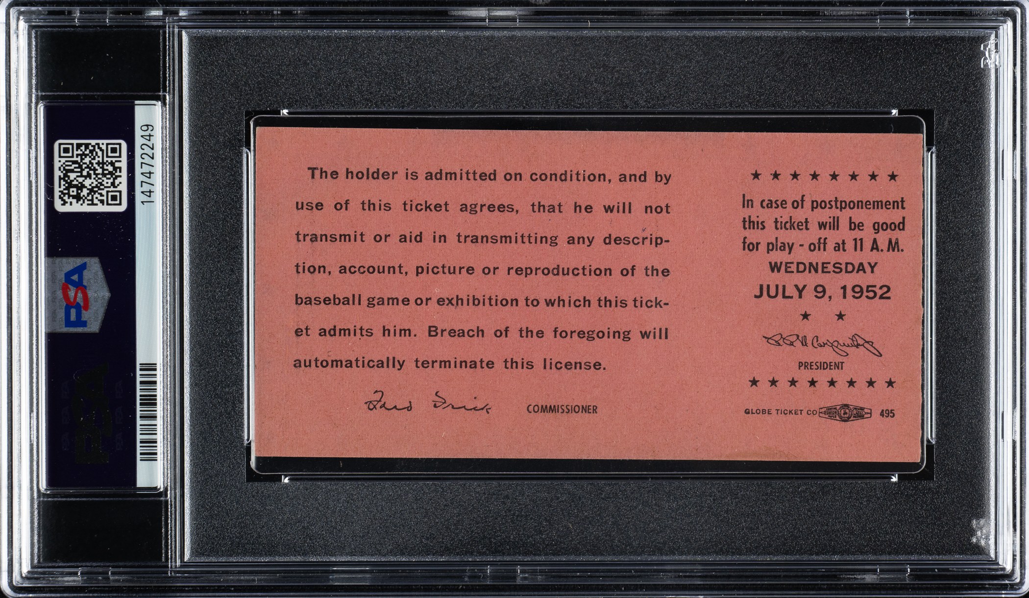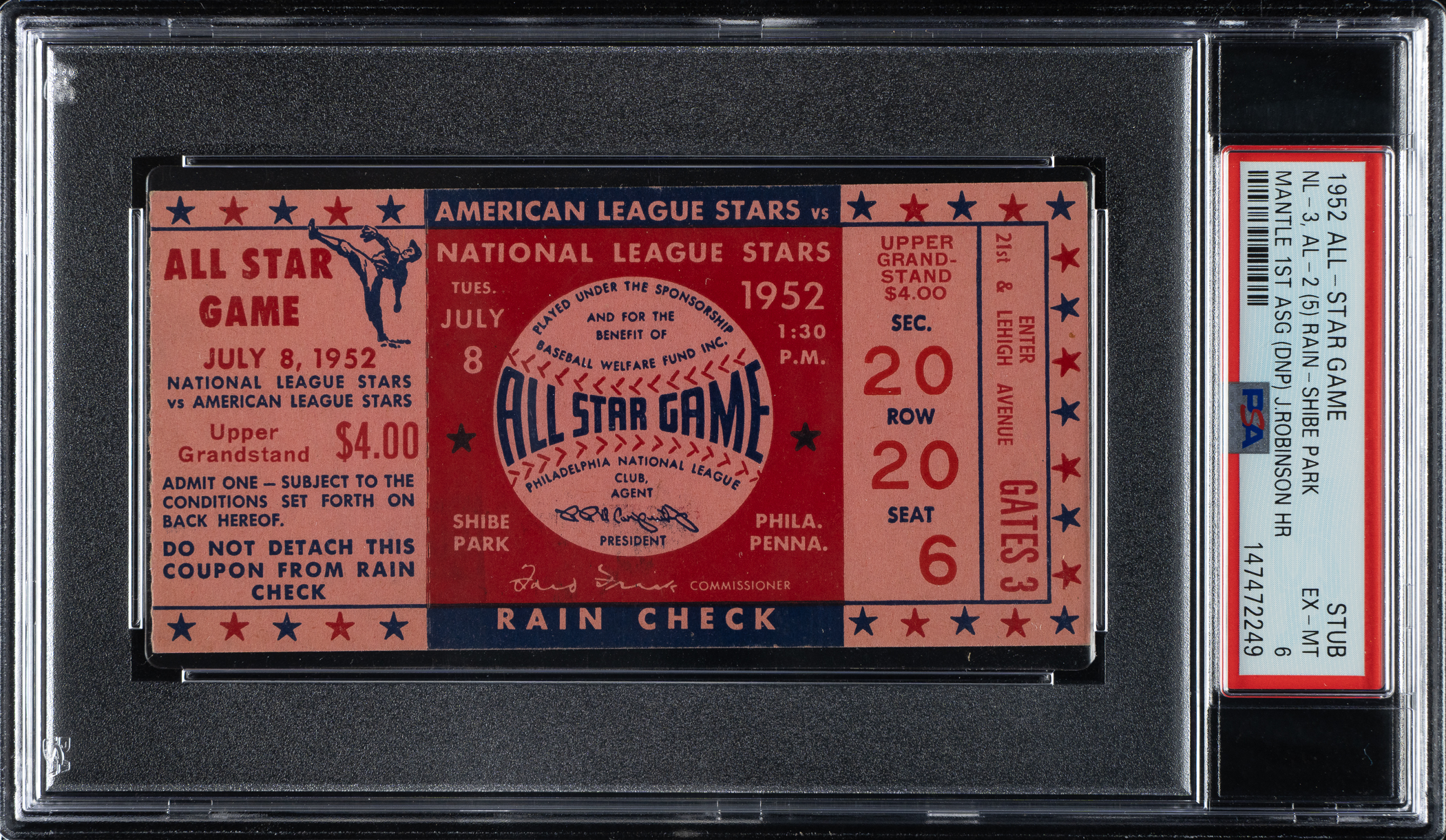 Graded EX-MT 6 by PSA. Ticket stub (4-5/8 x 2-1/4 inches) issued to the 1952 All-Star Game played at Shibe Park in Philadelphia. The National League defeated the American League 3-2 in this rain-shortened edition of the Midsummer Classic. Jackie Robinson homered for the victors. While Mickey Mantle and Satchel Paige were both selected as All Stars for the first time, neither appeared in the game.