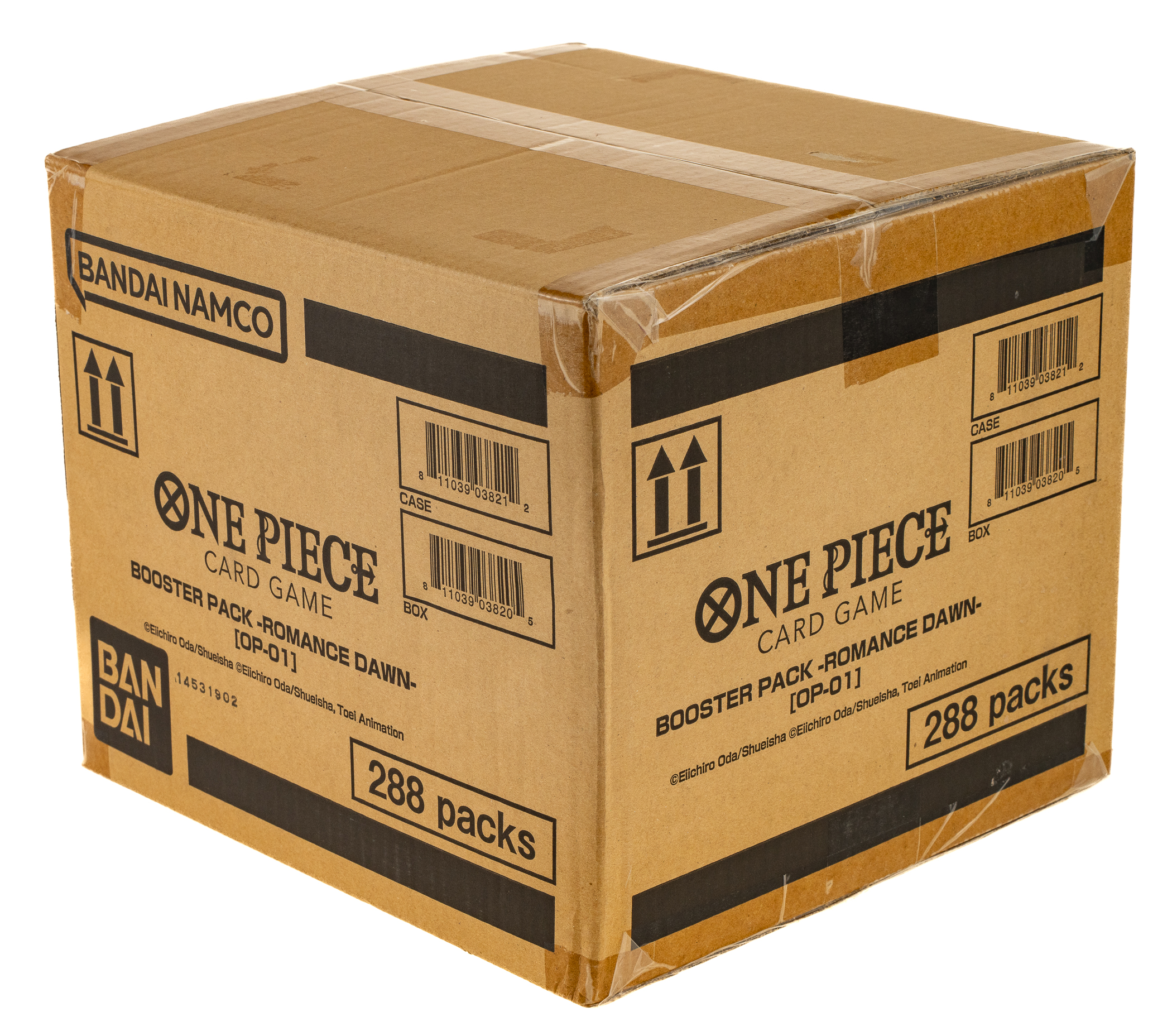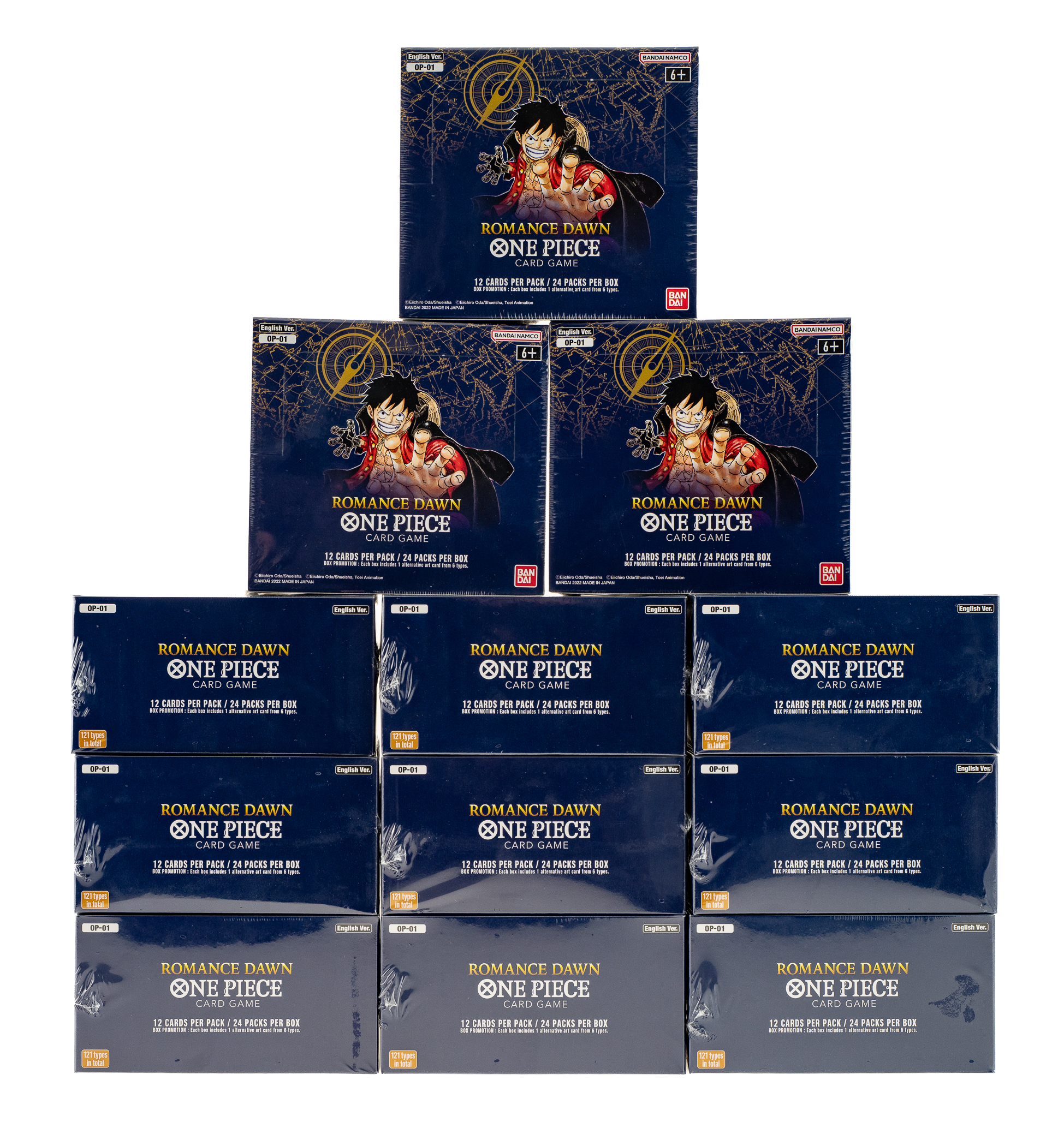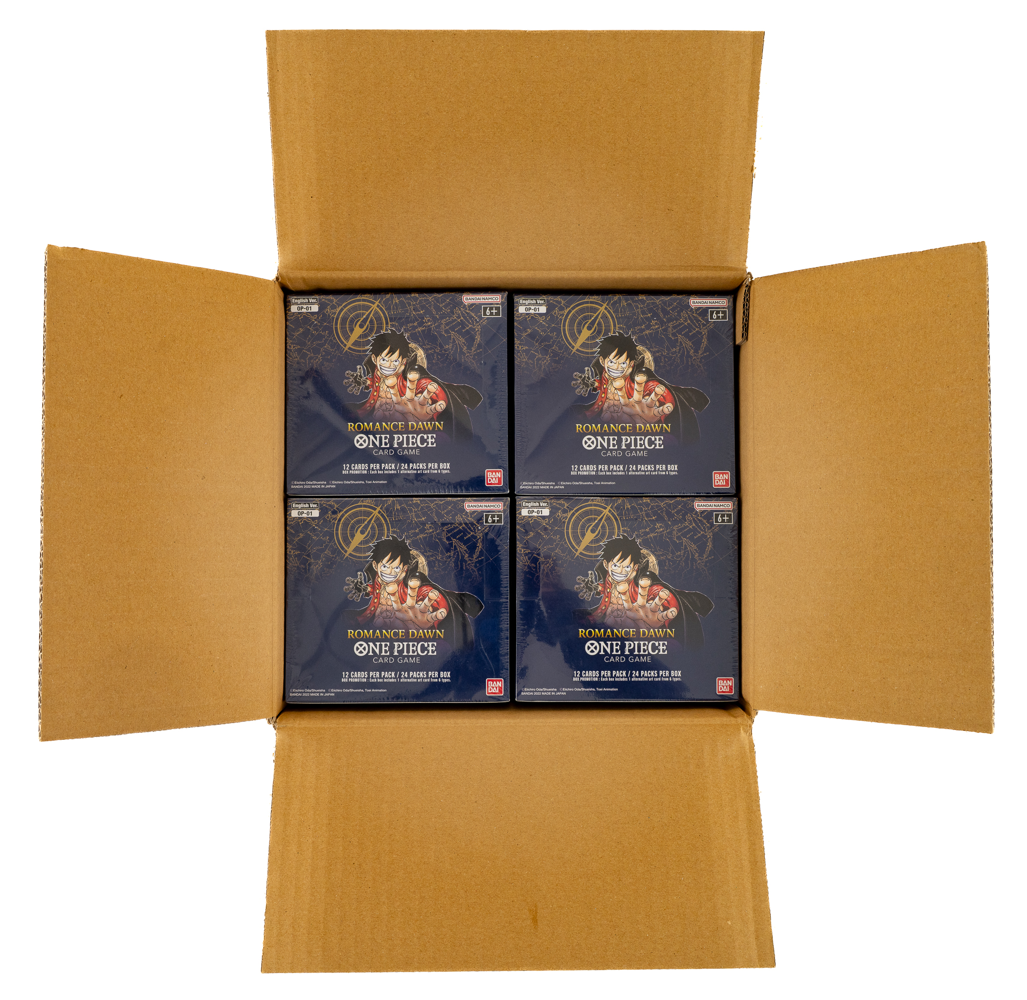 Presented is an extremely desirable original "Blue Bottom" booster box case (factory seals broken) from the 2022 Bandai One Piece Romance Dawn OP-01 Series. The case contains 12 unopened booster boxes with 24 packs per box, totaling 3,456 cards. This is one of the premier TCG cases in existence and one of the few opportunities collectors have had to acquire such a case outside of the year of issue! Serious One Piece collectors will immediately understand and recognize the OP-01 series boxes as having been issued with two variants: Blue Bottom and White Bottom. A number of cards had their printed text corrected and updated in the later "White Bottom" run, resulting in official errata versions circulating in addition to the pre-errata "Blue Bottom" varieties. This provides collectors with a point of distinction between early and later releases in the absence of a first-edition stamp. For collectors of unopened One Piece material, however, there is no such clear distinction between the outer boxes of the two print runs. Obtained by our consignor as a Blue Bottom case shortly after it was released, he dutifully kept it sealed for several years until consigning it to REA this spring. In an effort to ensure the case was advertised appropriately, as well as to capture the significance of the earlier print run for collectors, our consignor authorized us to open the case. We carefully opened the outer box and removed all 12 booster boxes to verify they were, in fact, the desirable Blue Bottom boxes.