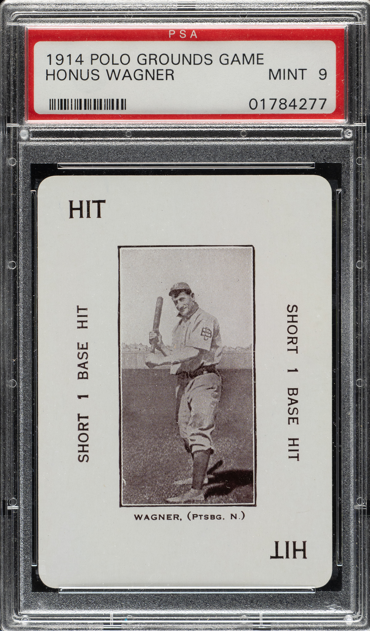 Graded MINT 9 by PSA. Superb high-grade example of this classic Honus Wagner card issued in 1914 as part of the Polo Grounds game card set. This particular card arguably represents the best value of all Wagner cards. This uncirculated card was obviously never played with and almost certainly survived in such pristine condition sealed in a complete deck. It is bright and clean, both front and back, with tremendous clarity.