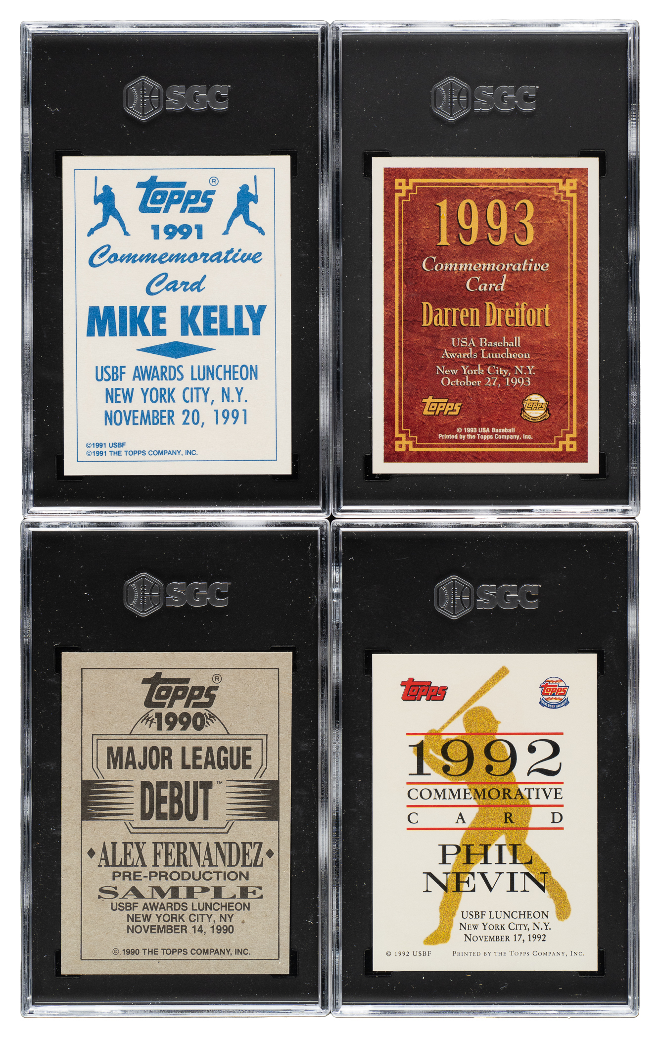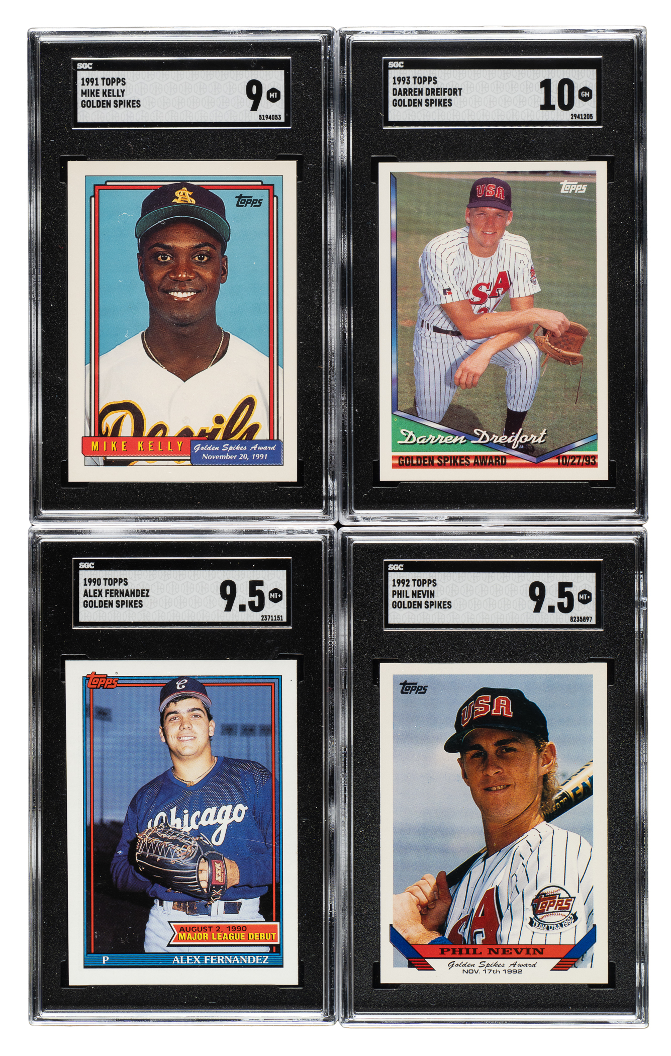 Rarely seen complete set of Topps "Golden Spikes Award" winner cards, each graded and encapsulated by SGC. From 1990 to 1993, Topps produced a card honoring that year's Golden Spikes' winner, presented to the top amateur baseball player in the country. The winner's card was subsequently distributed to the attendees of that year's USA Baseball annual luncheon, for that day only. This complete set consists of the following: 1990 Alex Fernandez (MINT+ 9.5), 1991 Mike Kelly (MINT 9), 1992 Phil Nevin (MINT+ 9.5), and 1993 Darren Dreifort (GEM MINT 10). Total: 4 cards.