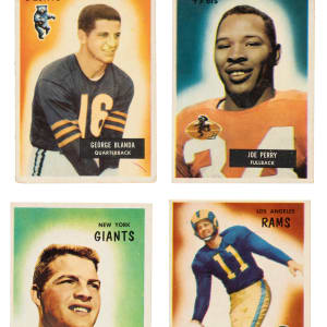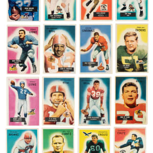 Complete 160-card set of 1955 Bowman Football, the last football-card set issued by Bowman Gum. Condition is 22% Ex to Ex-Mt (including a couple Nr/Mt), 64% Vg to Vg-Ex, and 14% lesser (including seven that measure small). Keys: #1 Walker (Ex), 2 McCormack RC (Vg), 7 Gifford (Vg+), 8 Ameche RC (Gd), 14 Ford RC (Vg-Ex), 32 Van Brocklin (Vg-Ex), 36 Stanfel RC (partially erased pencil on reverse, otherwise Ex), 42 Johnson RC (Ex+), 44 Perry (Vg-Ex), 52 Summerall RC (Vg), 62 Blanda (Vg), 70 Ringo RC (Gd+), 71 Layne (98/2 T/B, otherwise Vg-Ex), 72 Tittle (Vg-Ex), 75 McElhenny (Fr), 101 St. Clair RC (Gd), 119 Gatski RC (Gd+), 152 Landry (Vg), 158 Bednarik (Vg+), and 160 Dupre (Gd). Very attractive mid-grade set of this classic mid -1950s Bowman football issue, which is loaded with stars and Hall of Famers. Total: 160 cards.