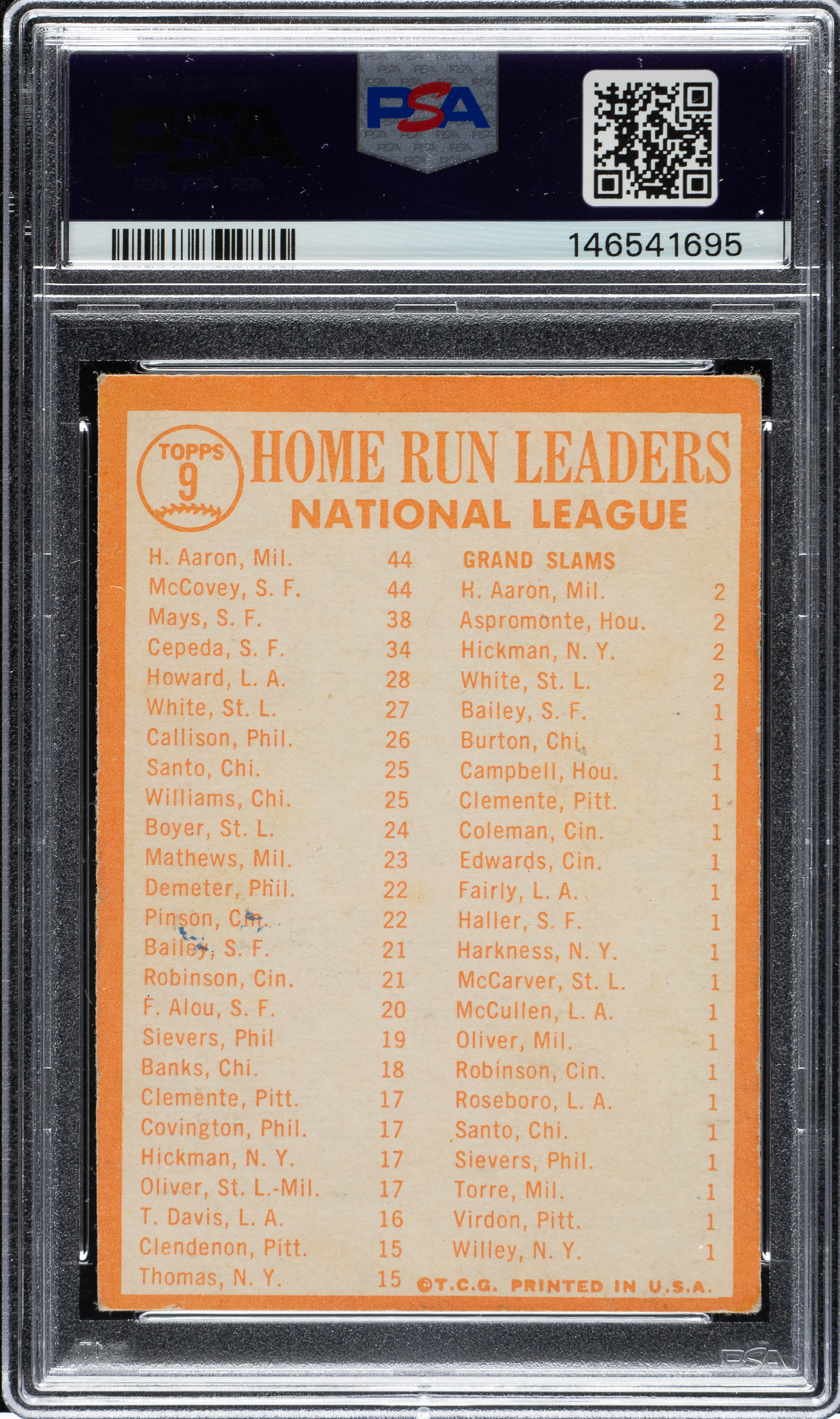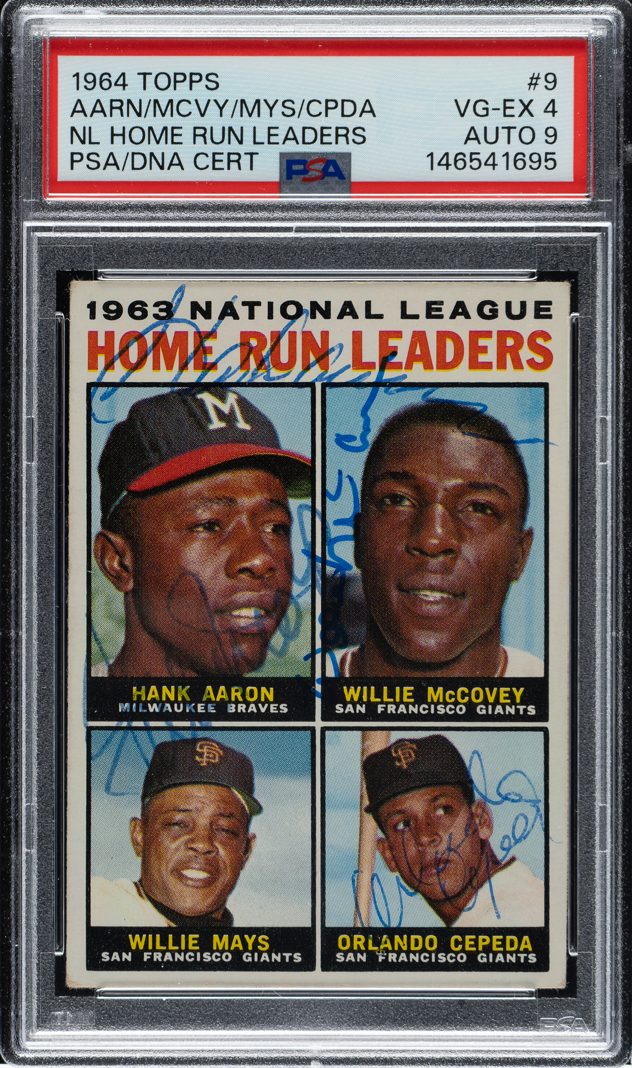 PSA/DNA has encapsulated the card, grading the signatures MINT 9 and the card VG-EX 4. Milwaukee Braves and San Francisco Giants Hall of Famers Hank Aaron, Willie McCovey, Willie Mays, and Orlando Cepeda.