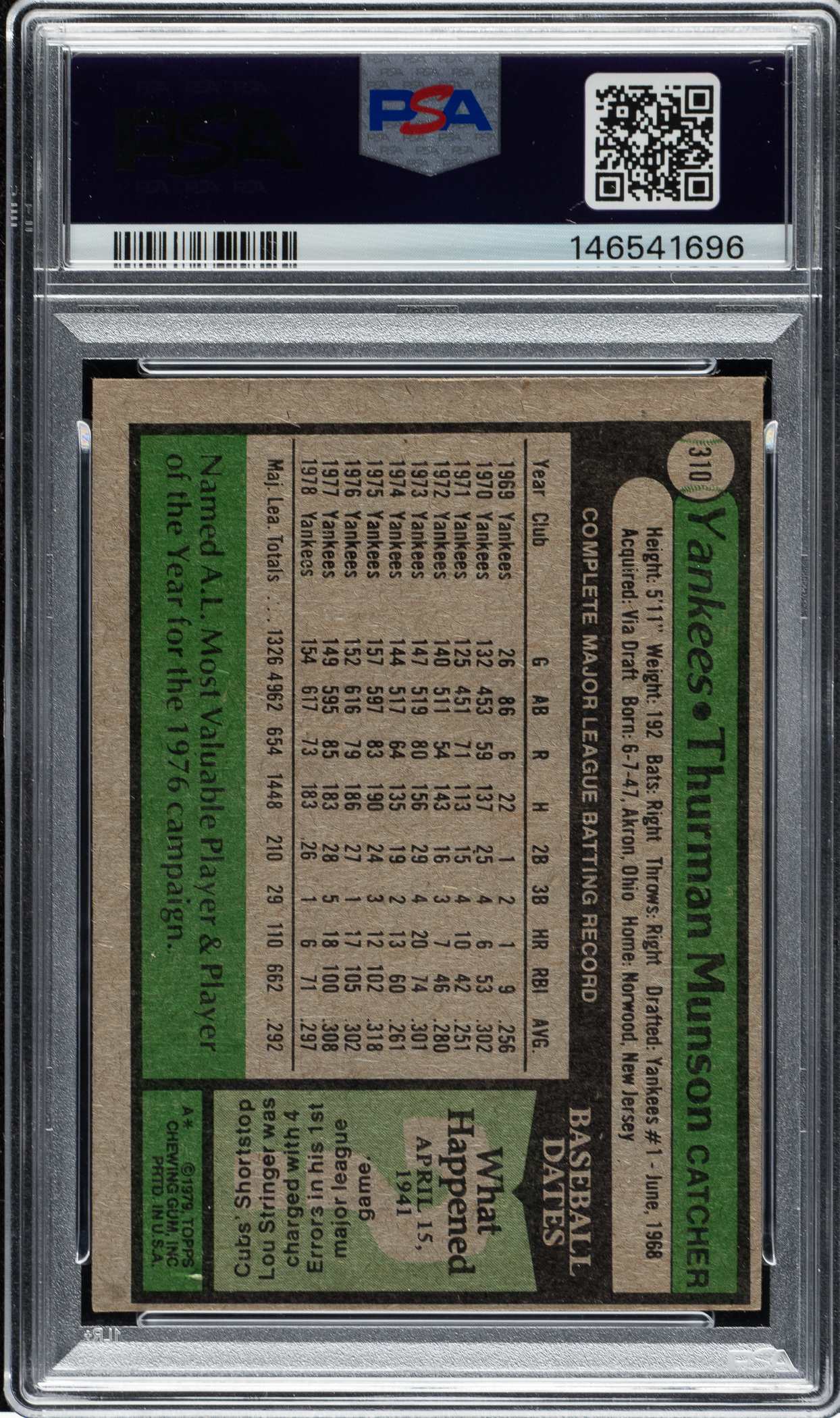 1979 Topps Thurman Munson card #310 signed in blue ink across the front. PSA/DNA has encapsulated the card, grading both the signature and card as NM 7. This is the only signed example of this card graded NM 7 by PSA/DNA, with none graded higher. As most collectors are aware, Munson was never known as a prolific signer during his playing career and normally shunned the attention of the fans. That fact, combined with his death in 1979 at the age of 32, has resulted in a scarcity of Munson-signed items today. Vintage autographed baseball cards have become extremely popular among collectors in recent years, especially those from classic issues signed by prominent superstars.