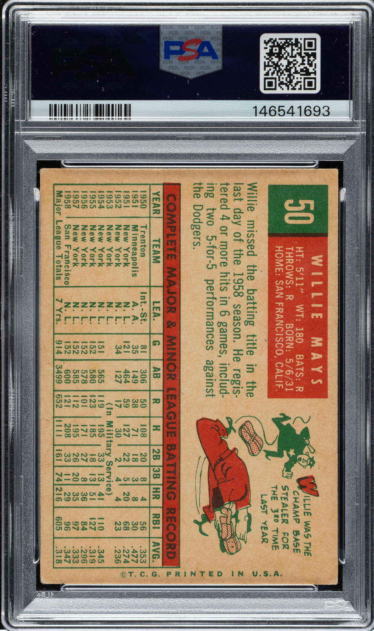 PSA/DNA has encapsulated the card, grading the signature NM 7 and the card VG+ 3.5. San Francisco Giants Hall of Famer Willie Mays.